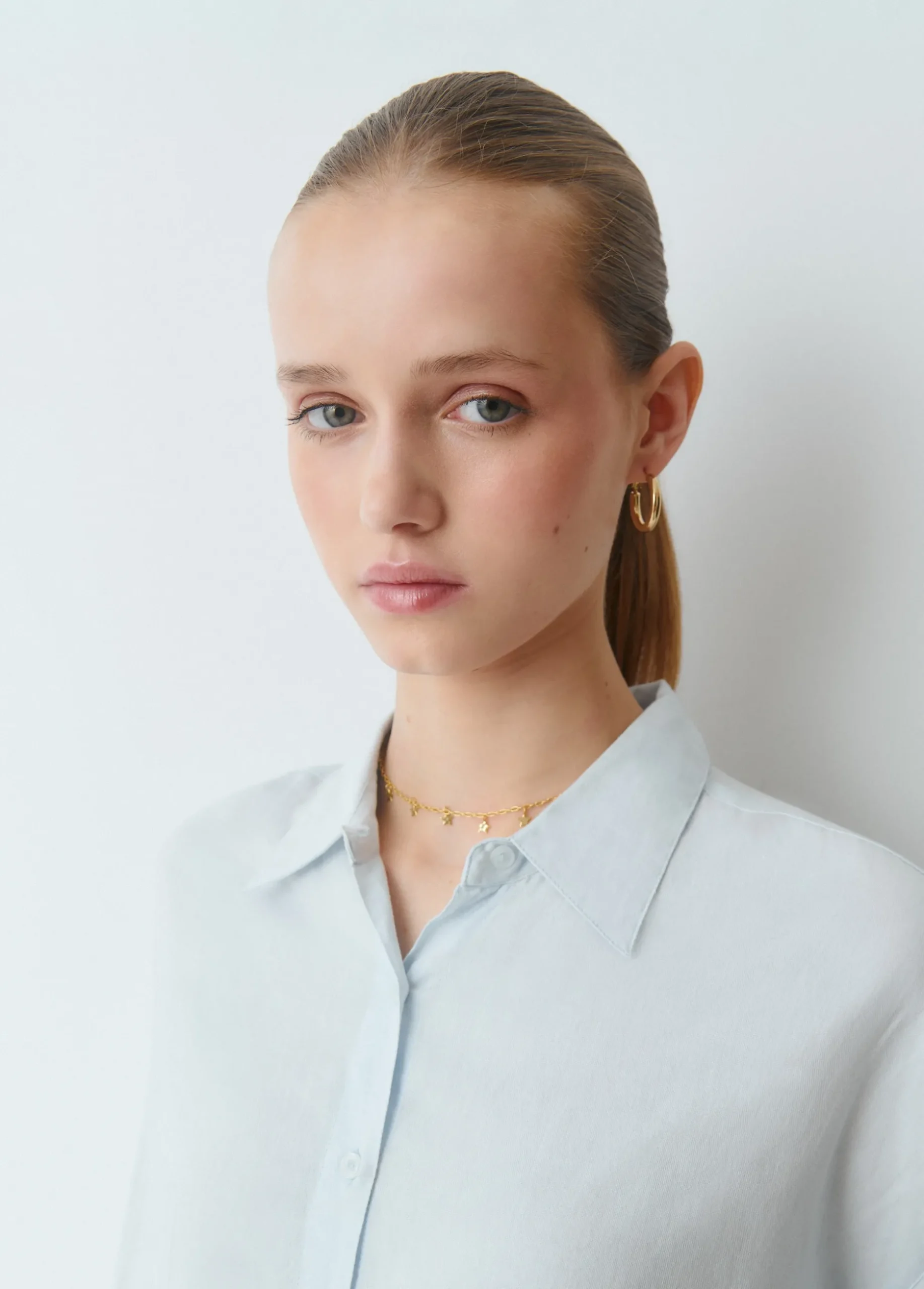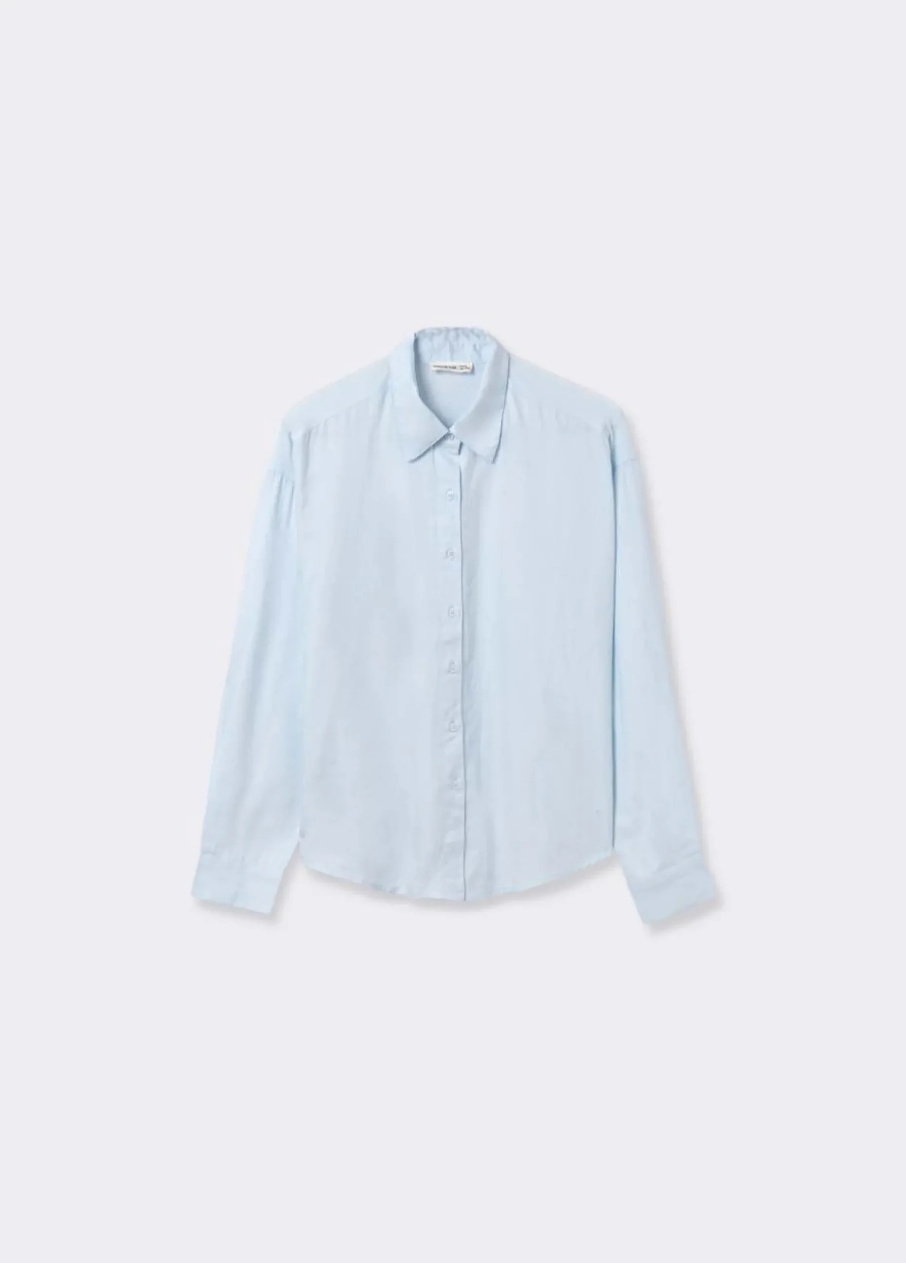 Camisa básica lisa de manga larga, cuello con solapas y cierre mediante botones en el frontal.