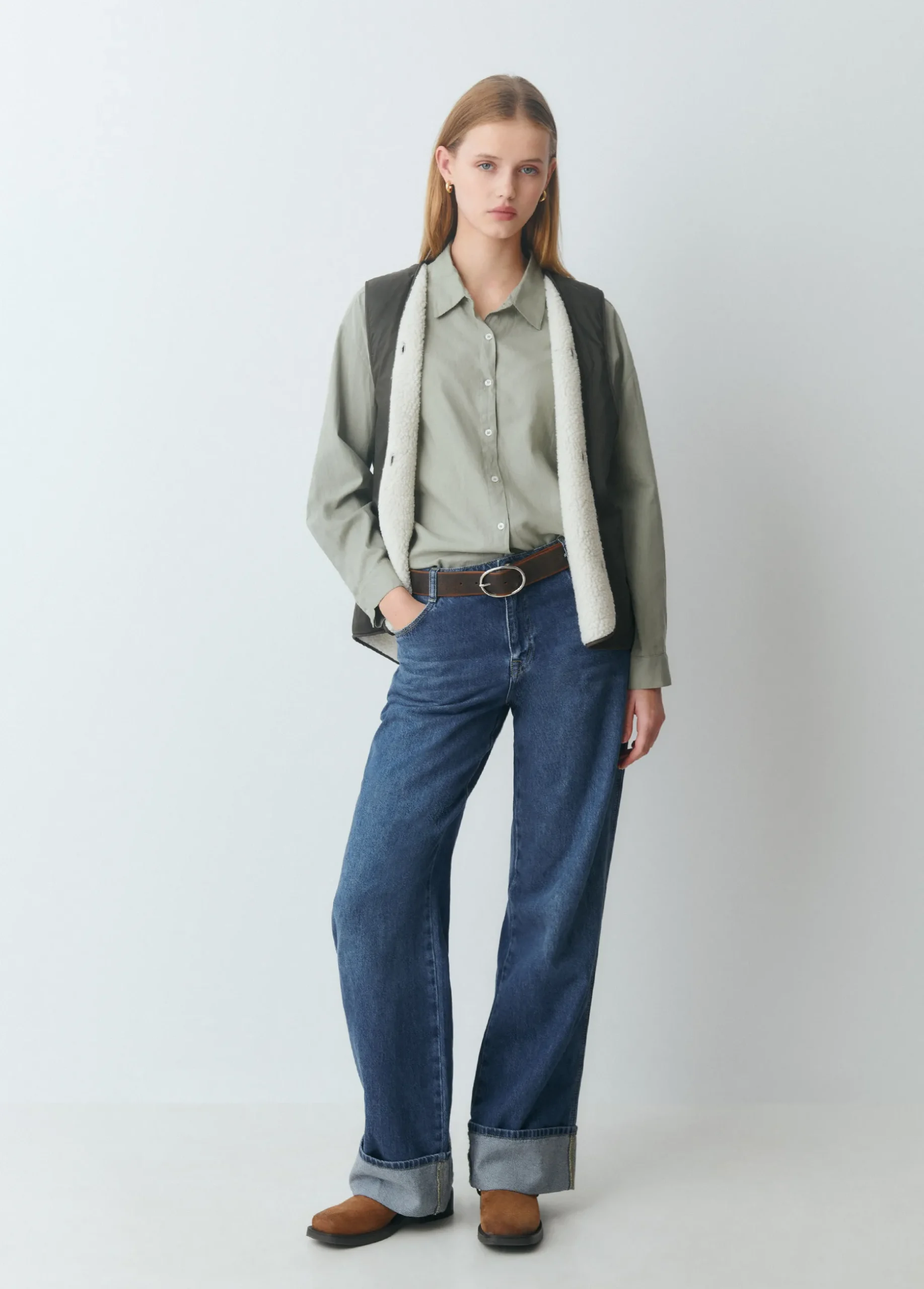 Camisa básica lisa de algodón de manga larga, cuello con solapas, cierre mediante botones en el frontal y detalle de bolsillo.
