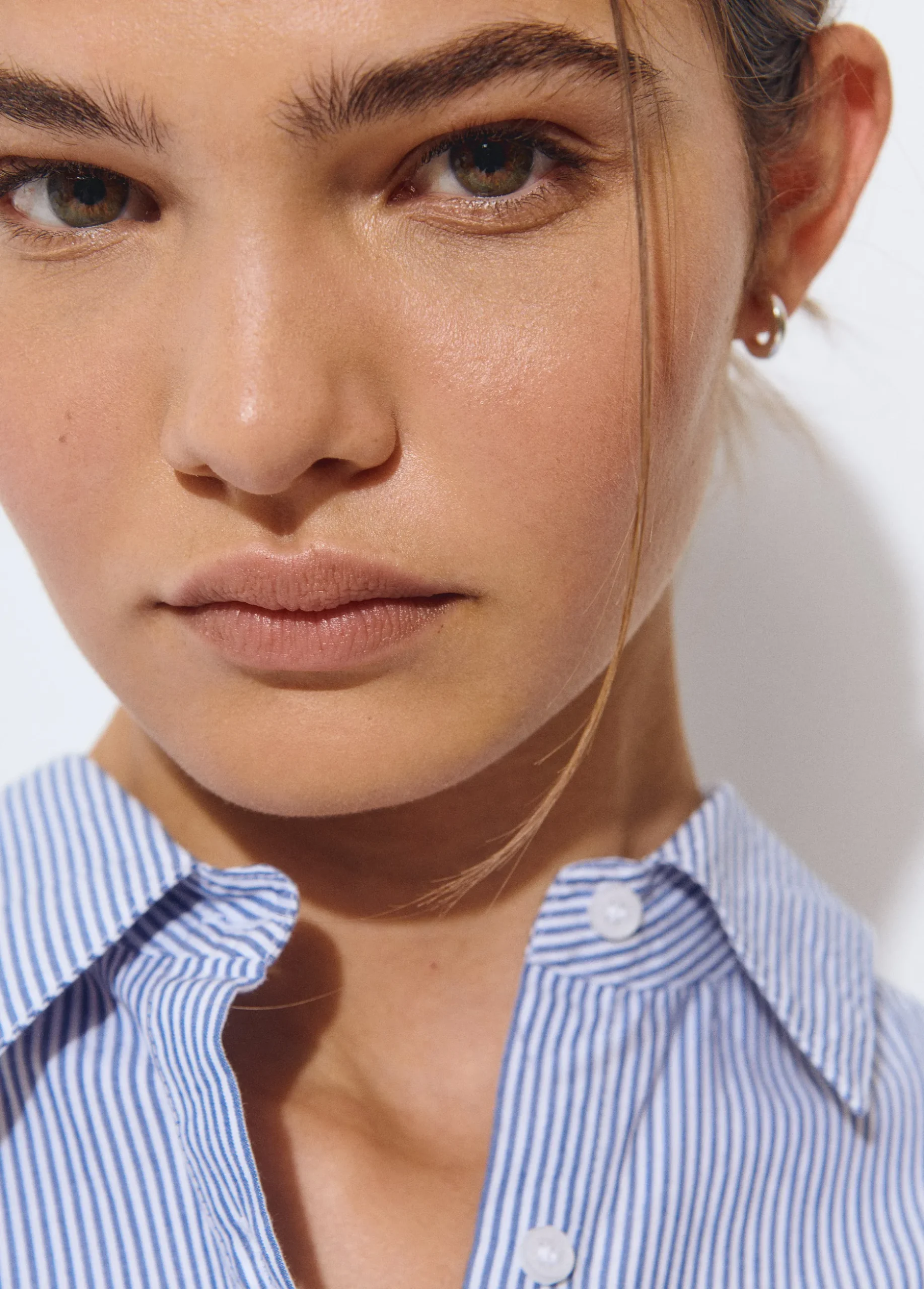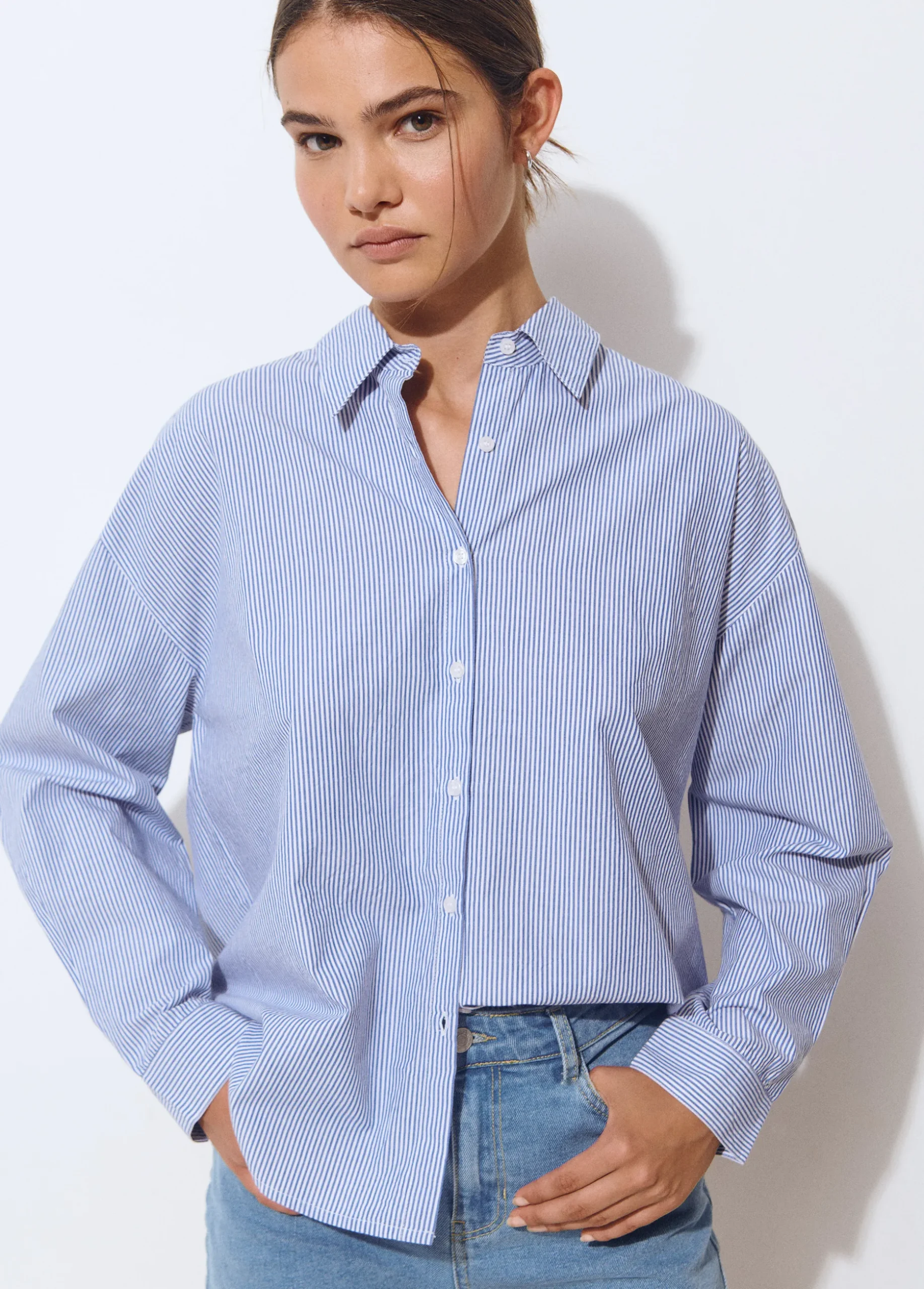 Camisa de rayas de algodón de manga larga, cuello con solapas y cierre mediante botones en el frontal.