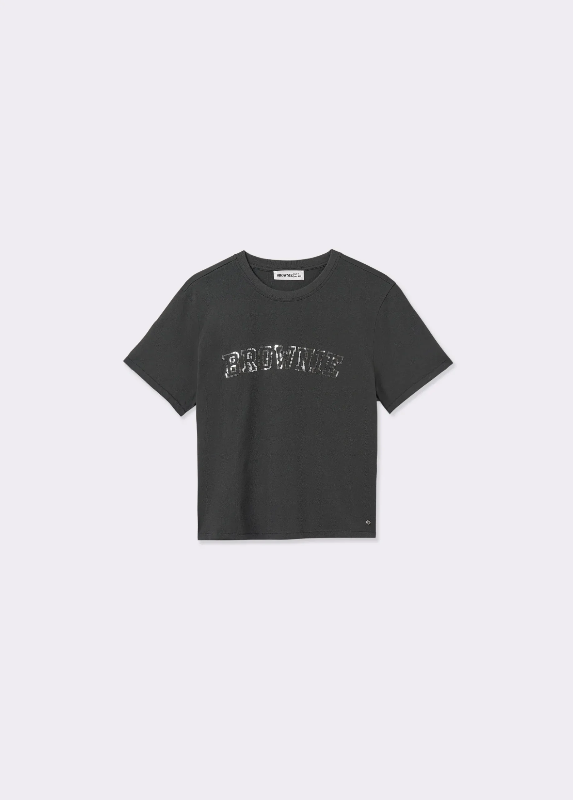 Camiseta de manga corta, cuello redondo y texto bordado con lentejuelas.