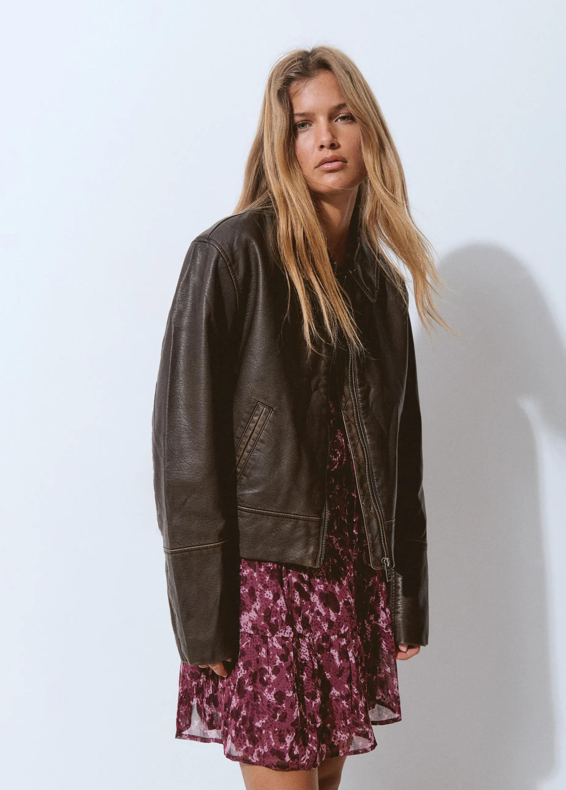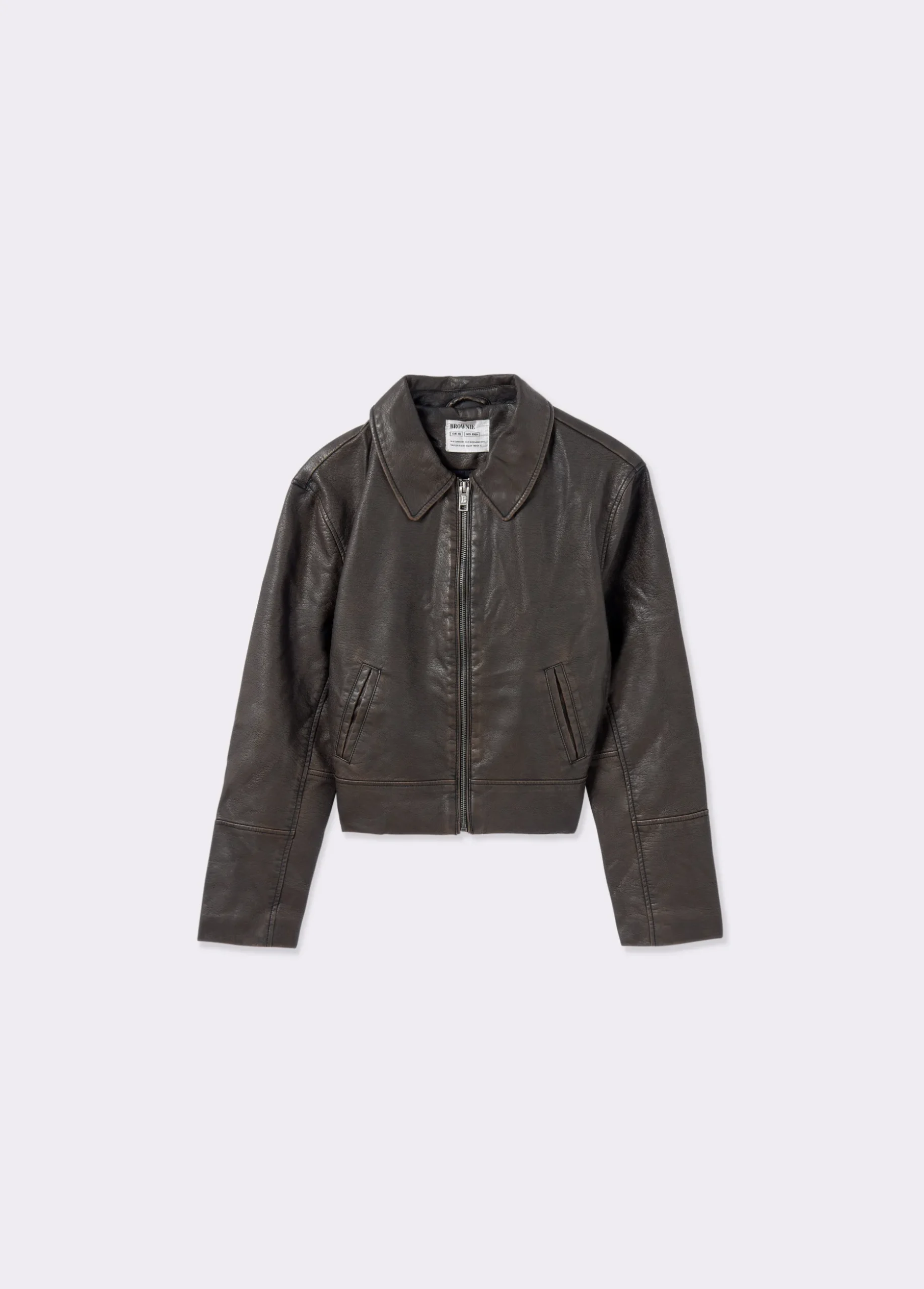 Cazadora de manga larga efecto piel con cuello con solapas y bolsillos frontales. Cierre mediante cremallera.