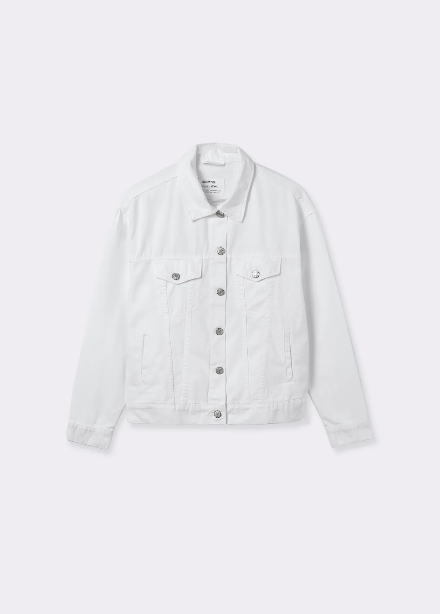 Chaqueta tejana oversize de manga larga, cuello con solapas, bolsillos frontales y cierre mediante botones.