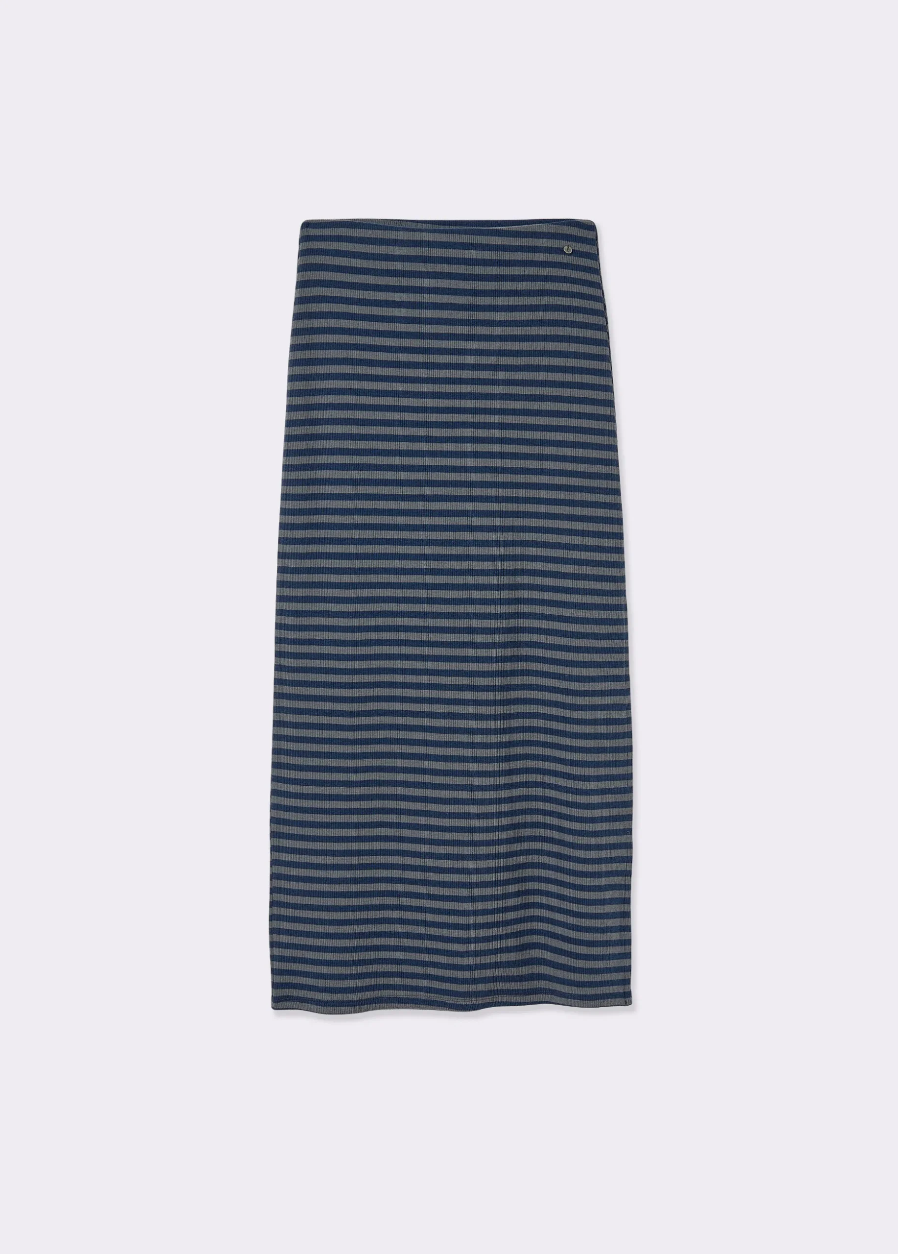 Falda midi de rayas con goma en la cintura y detalle de apertura.