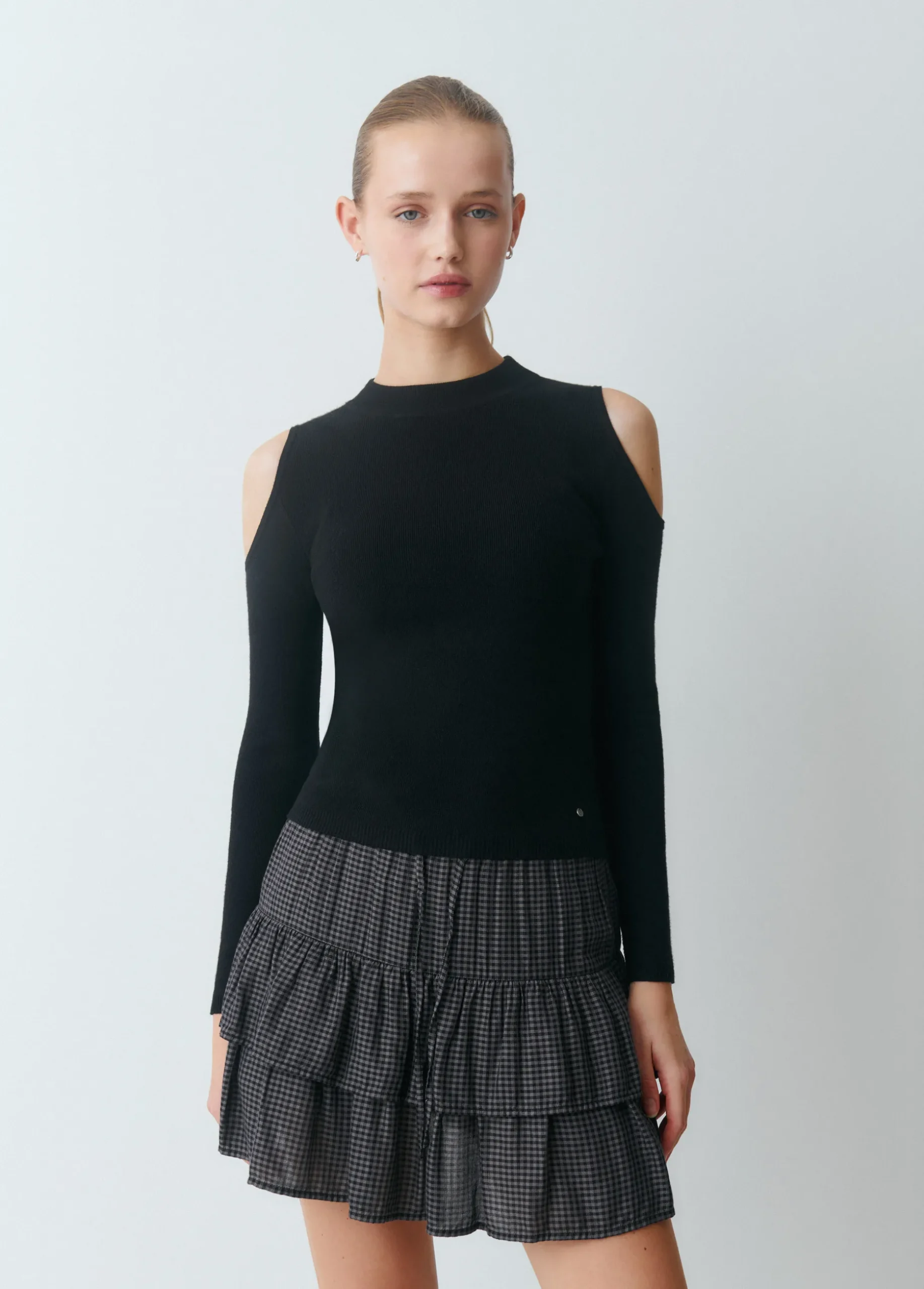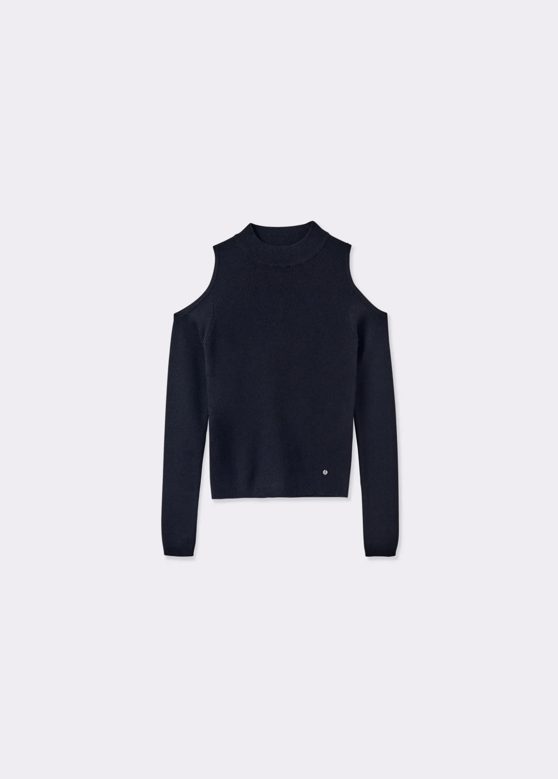 Jersey de manga larga, cuello redondo y hombros descubiertos.