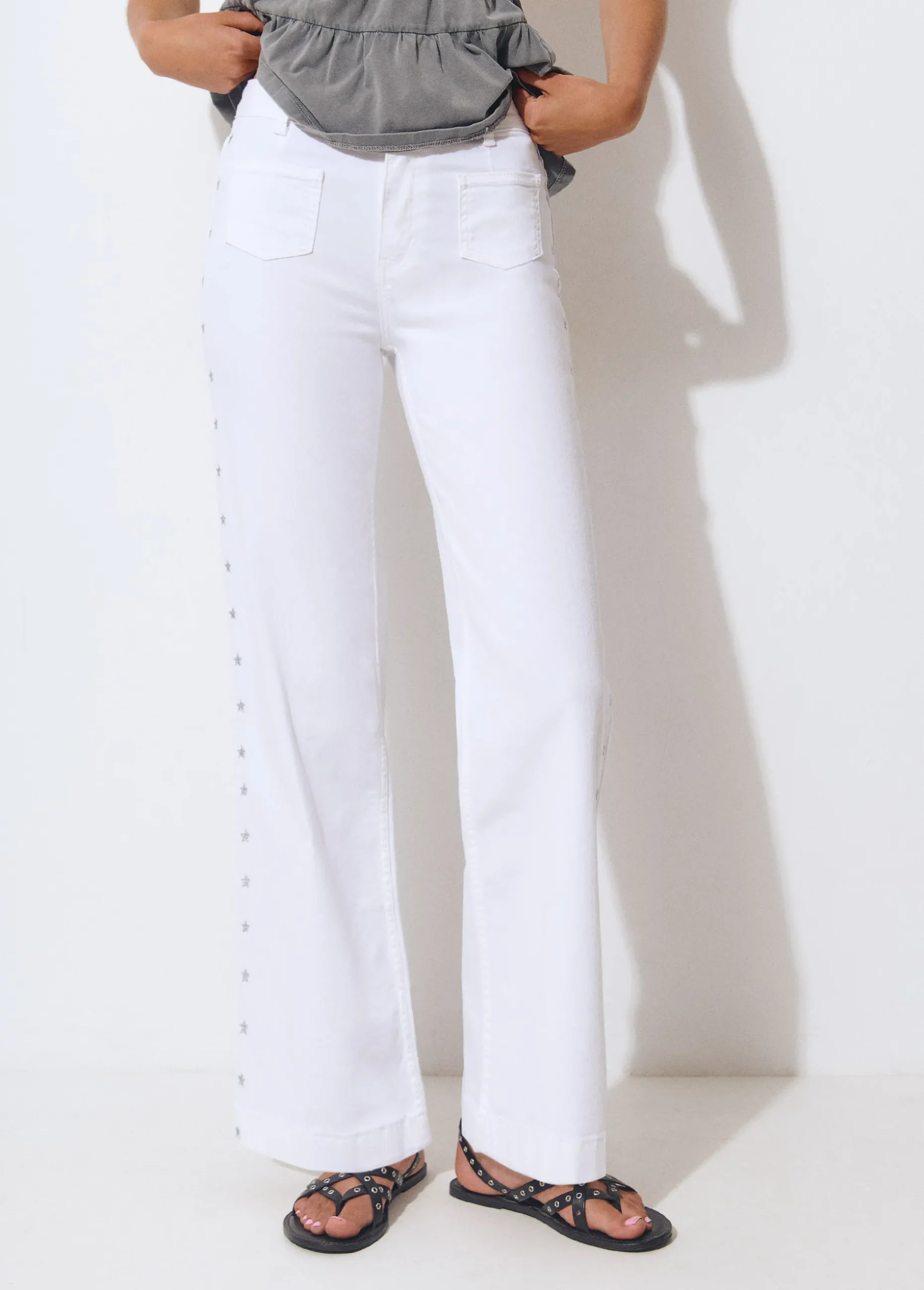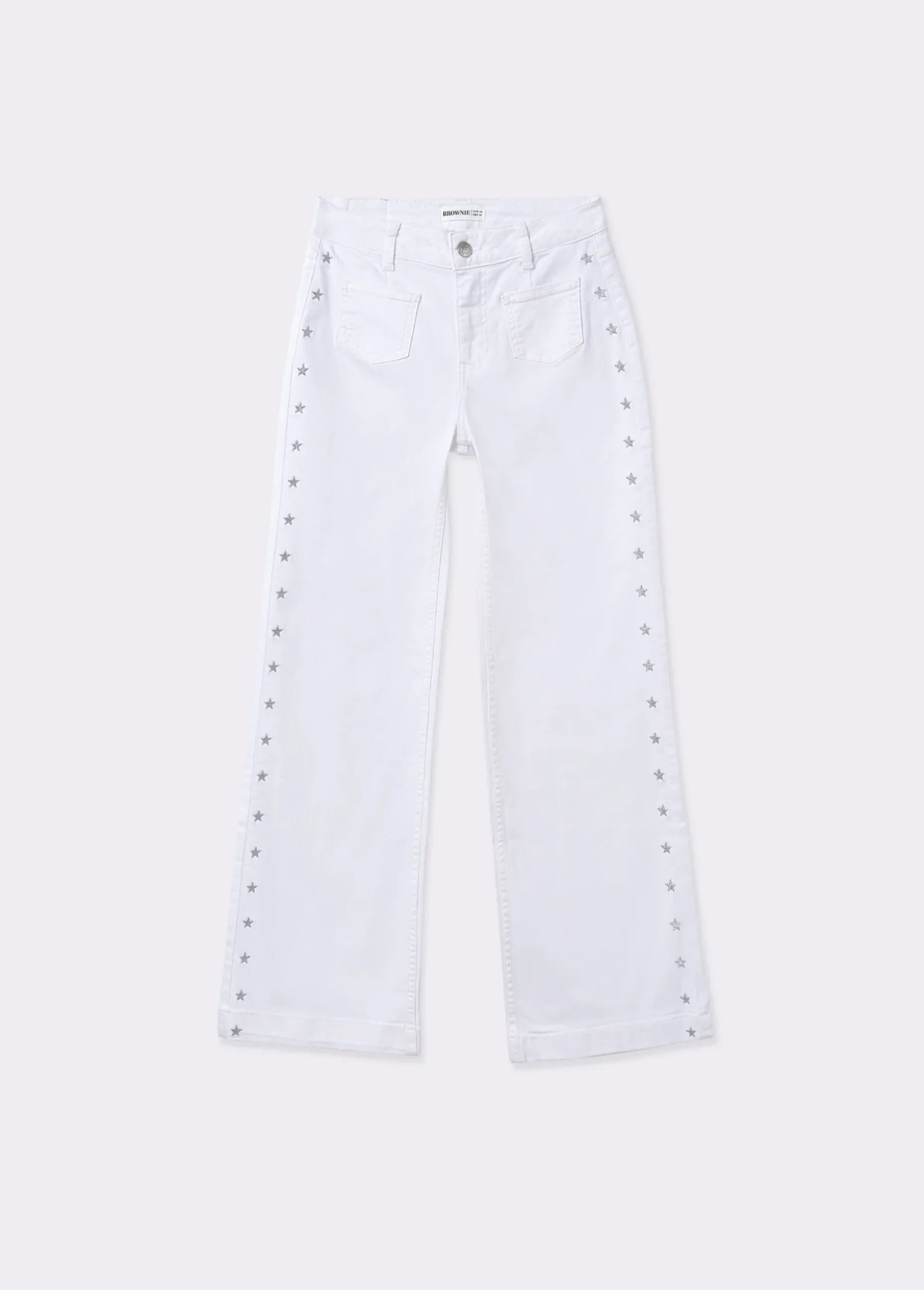 Pantalón culotte de tiro medio con bolsillos en la parte frontal y detalle de apliques metálicos de estrellas.