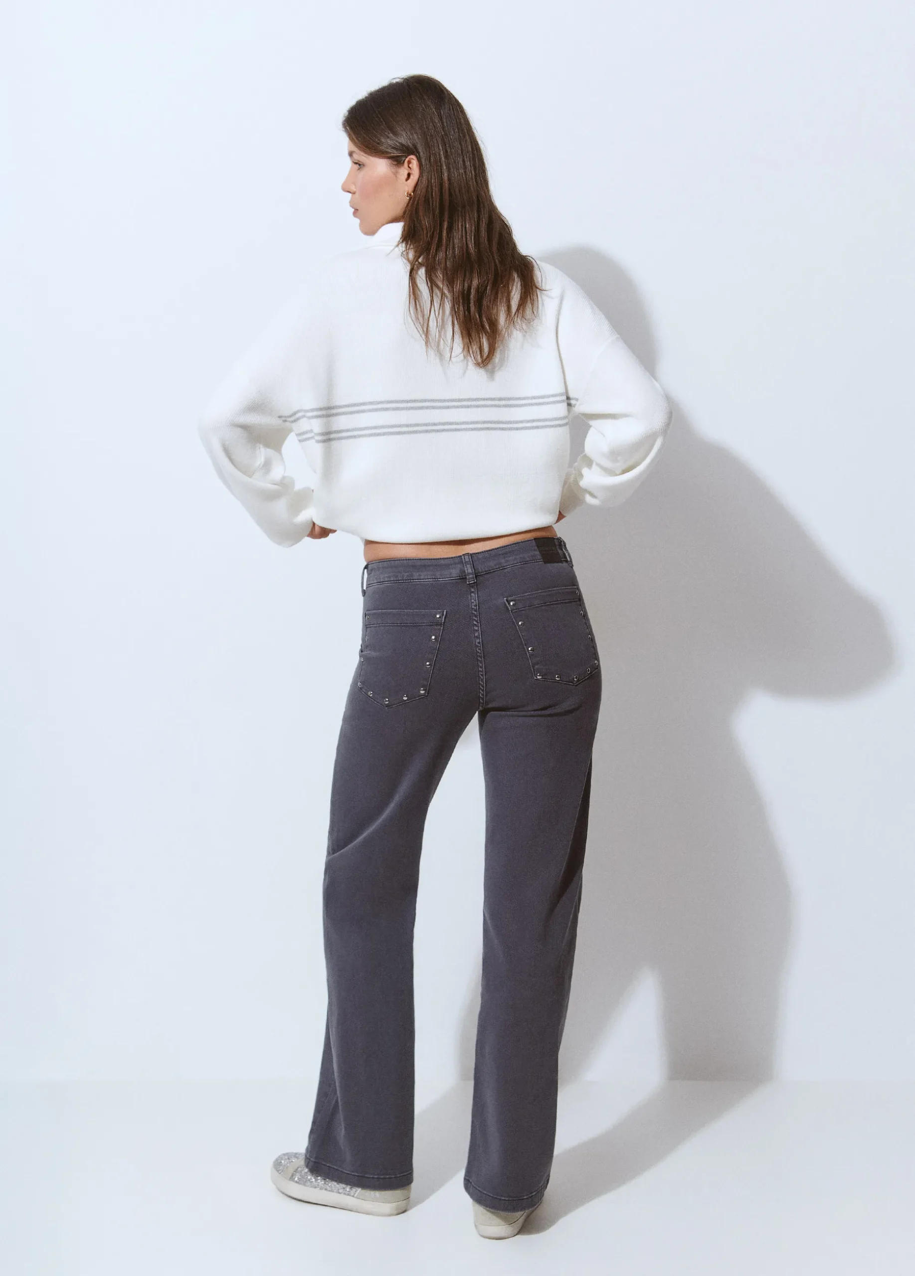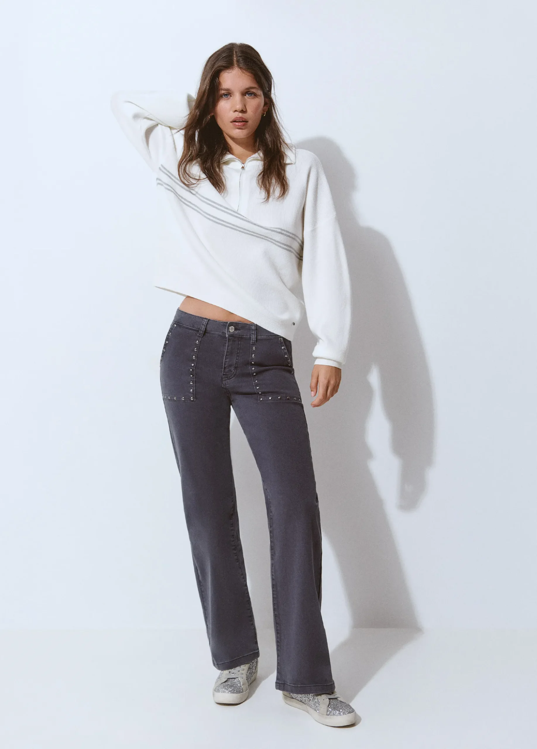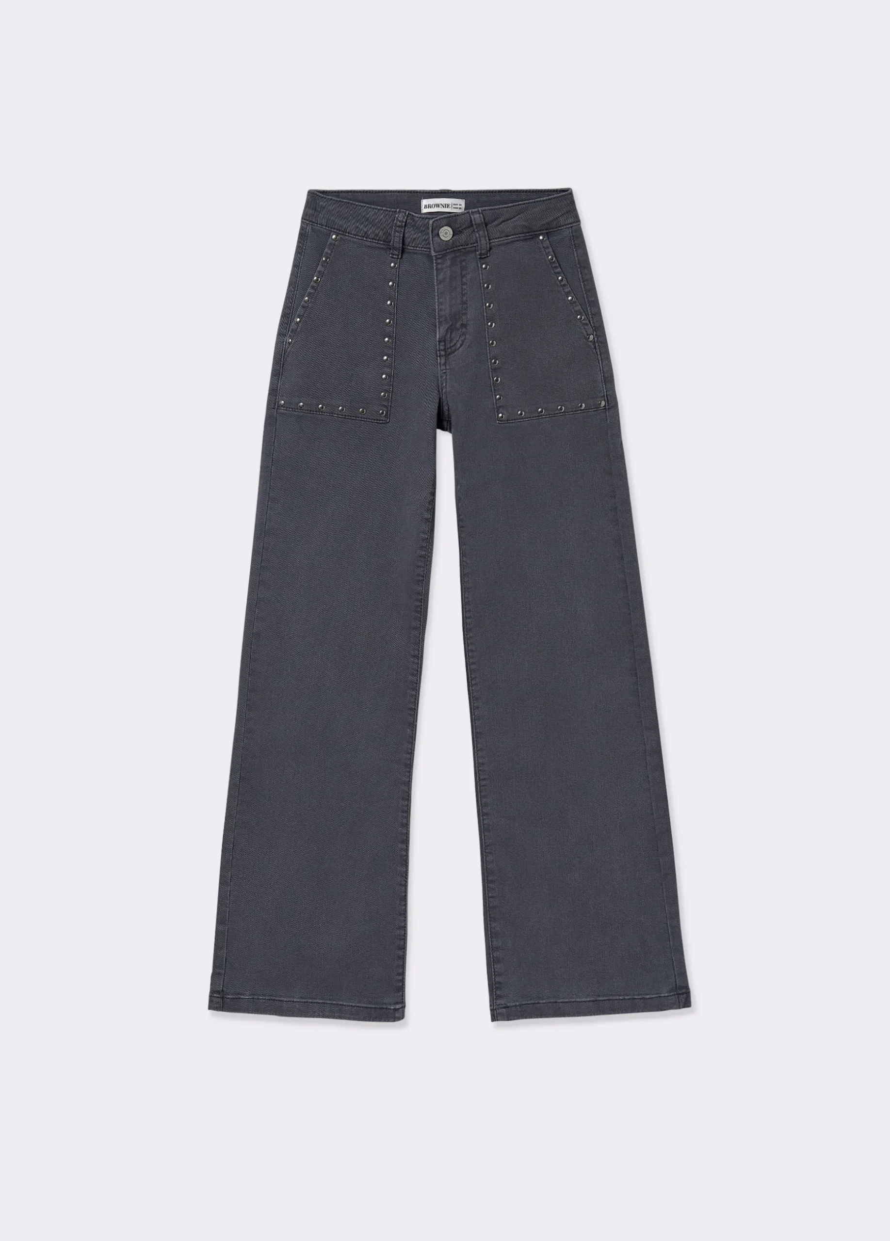 Pantalón culotte de tiro medio con maxi bolsillos en el frontal y detalle de tachas.