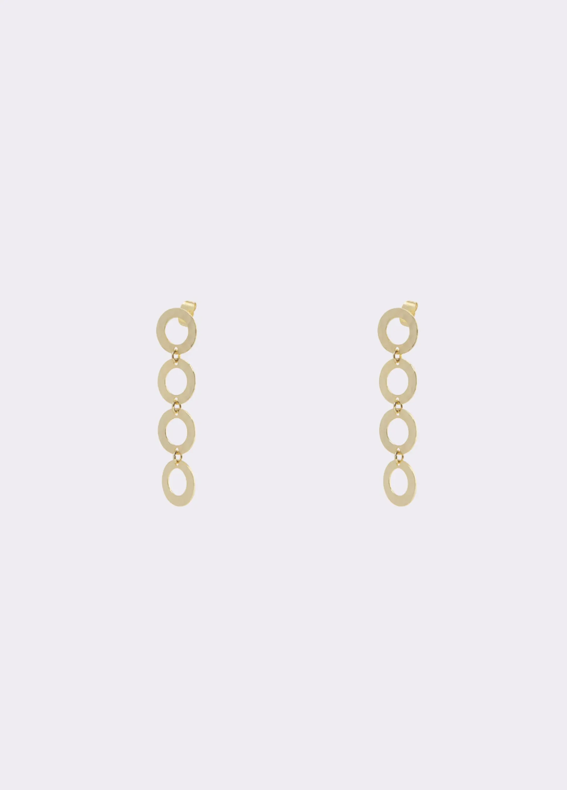 Pendientes largos dorados con varios aros en forma circular. Cierre de presión.