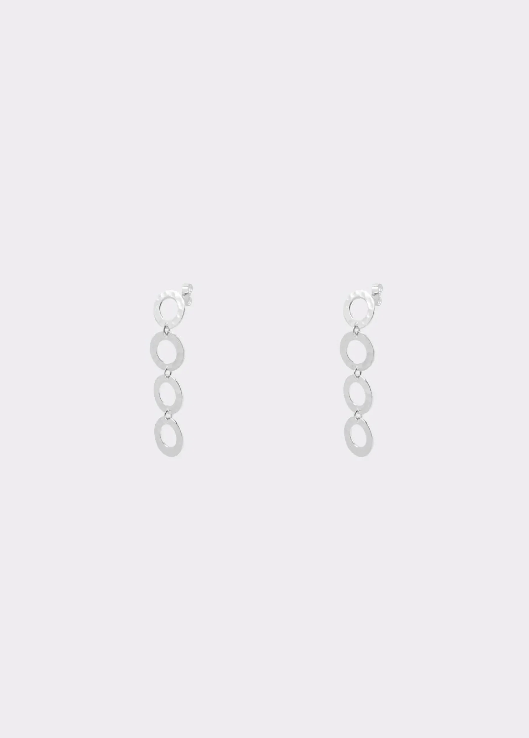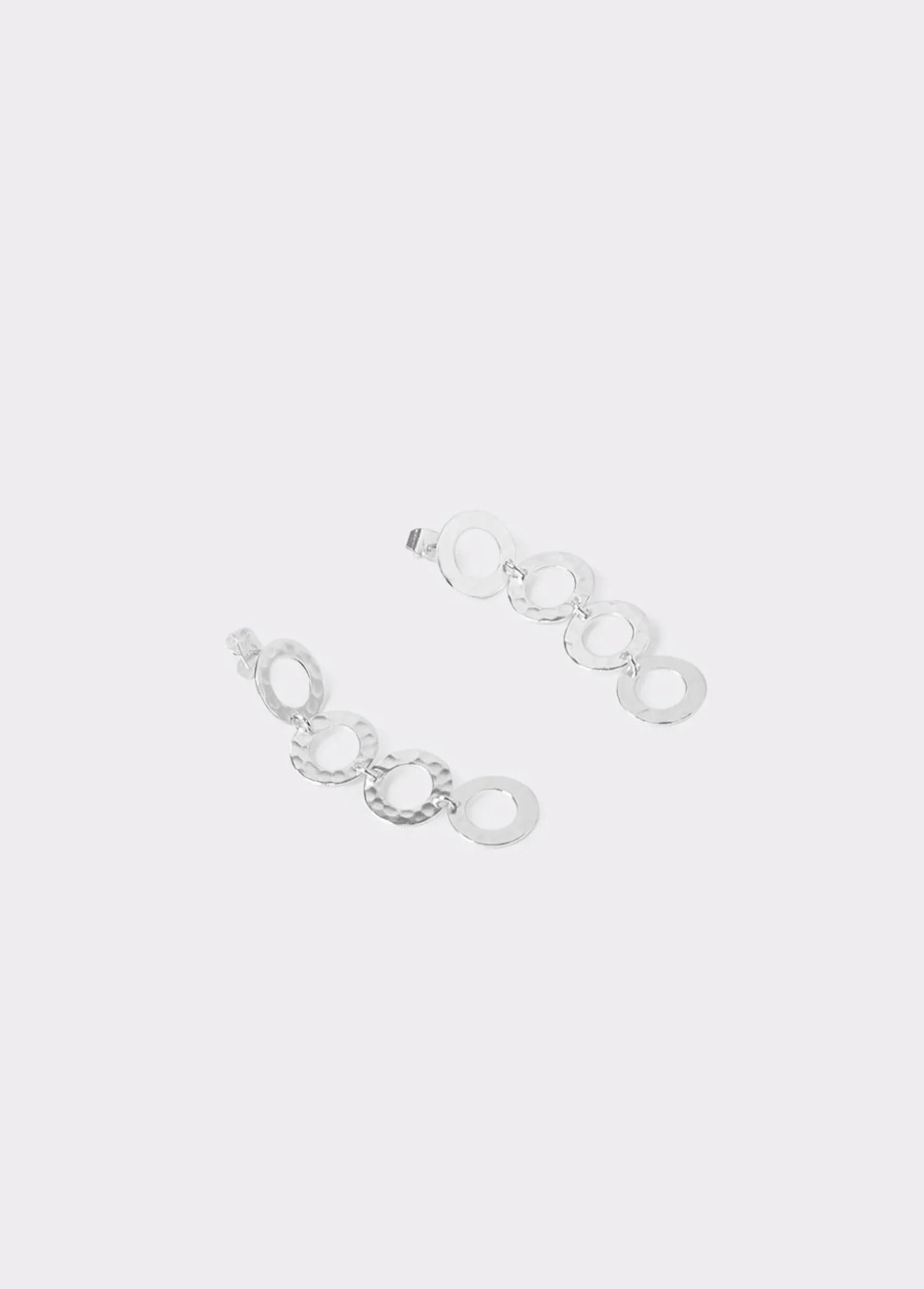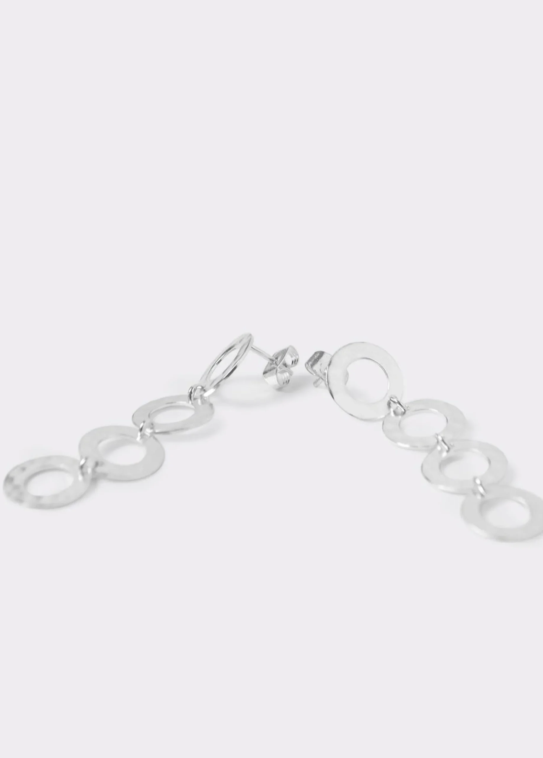 Pendientes largos plateados con varios aros en forma circular. Cierre de presión.