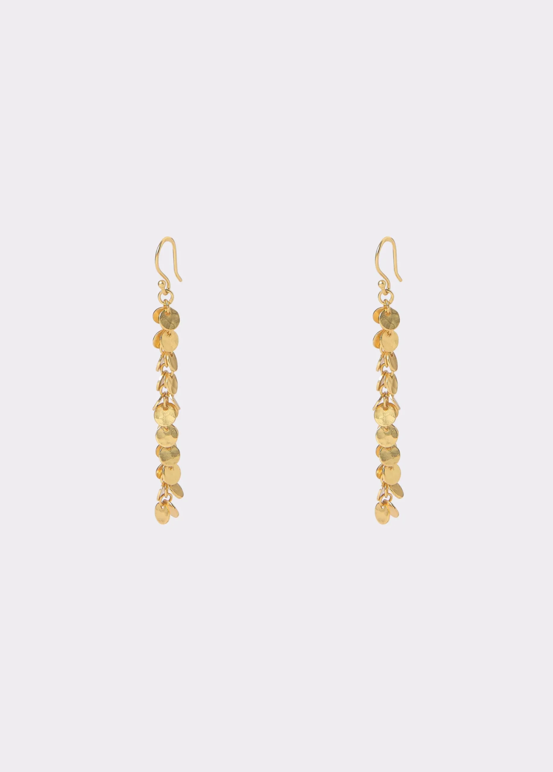 Pendientes dorados largos de chapas grabadas. Cierre de gancho.