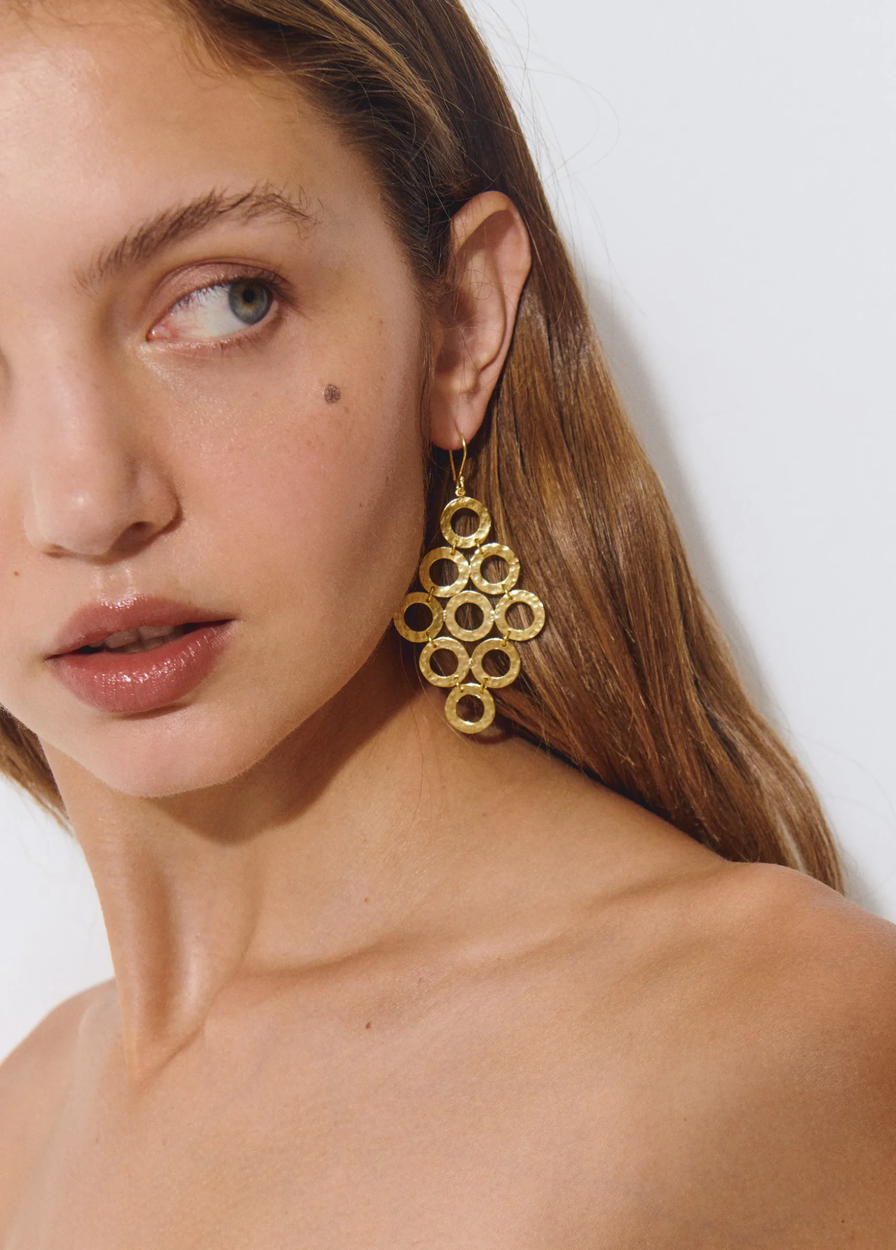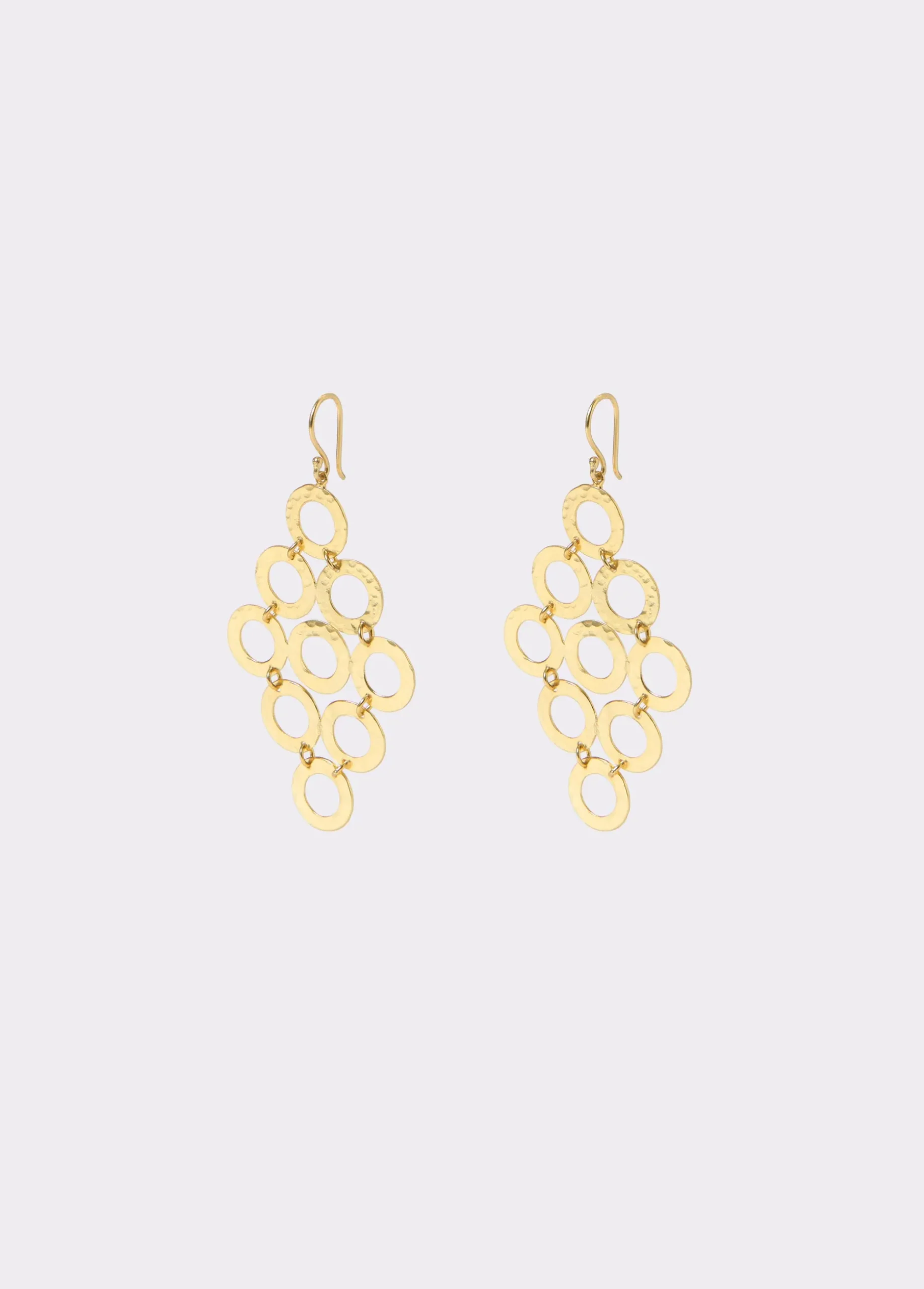Pendientes en forma de rombos dorados con varios aros en forma circular. Cierre de gancho.