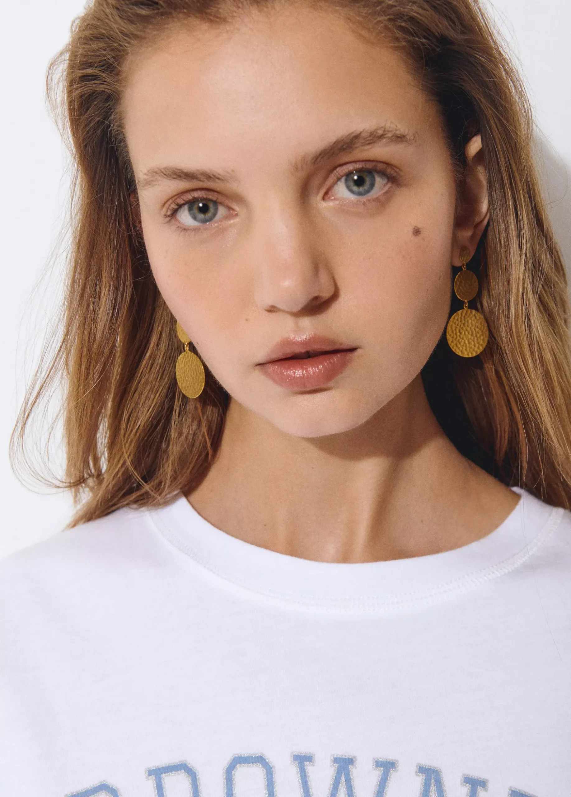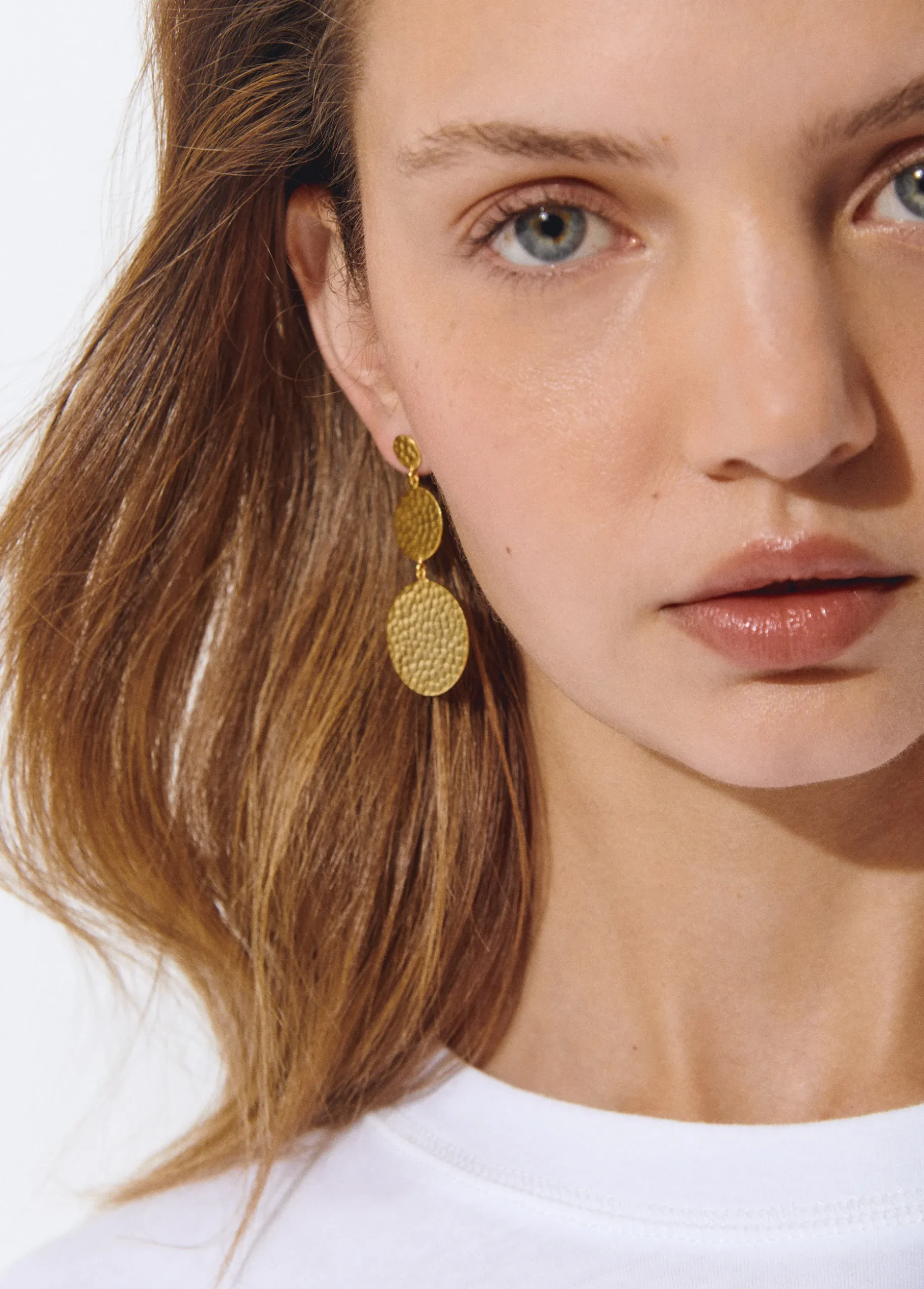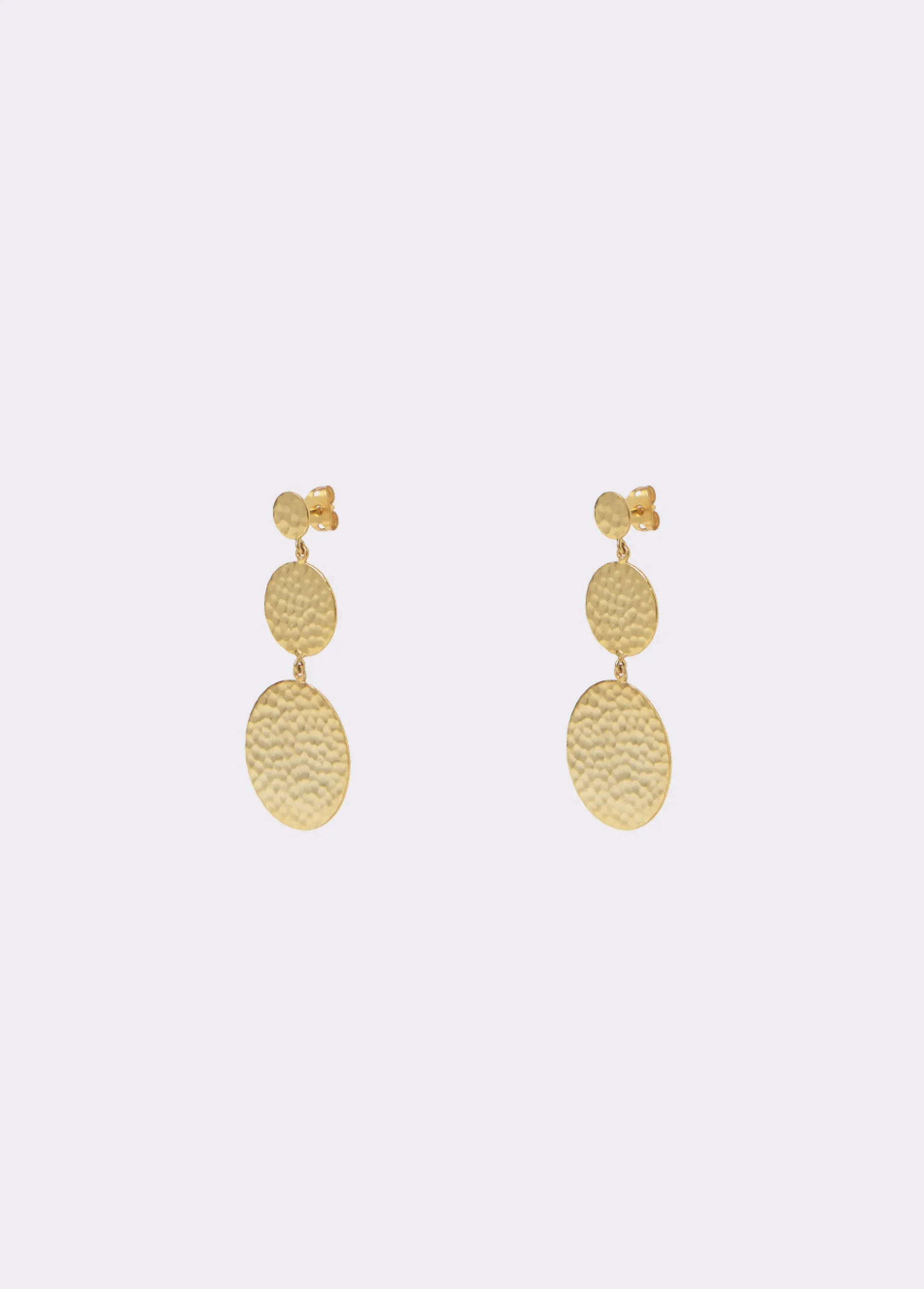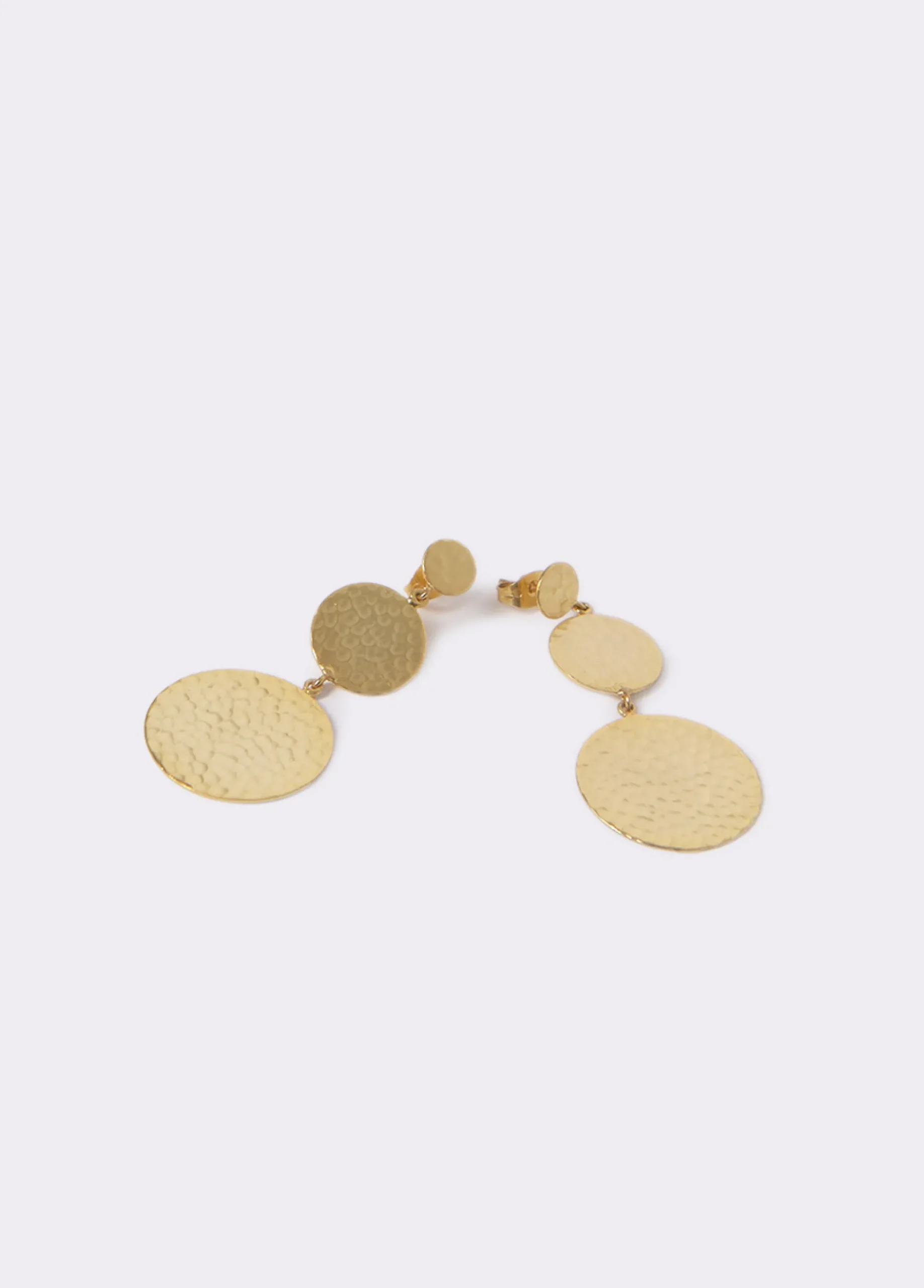 Pendientes largos dorados con forma de tres discos. Cierre de presión.
