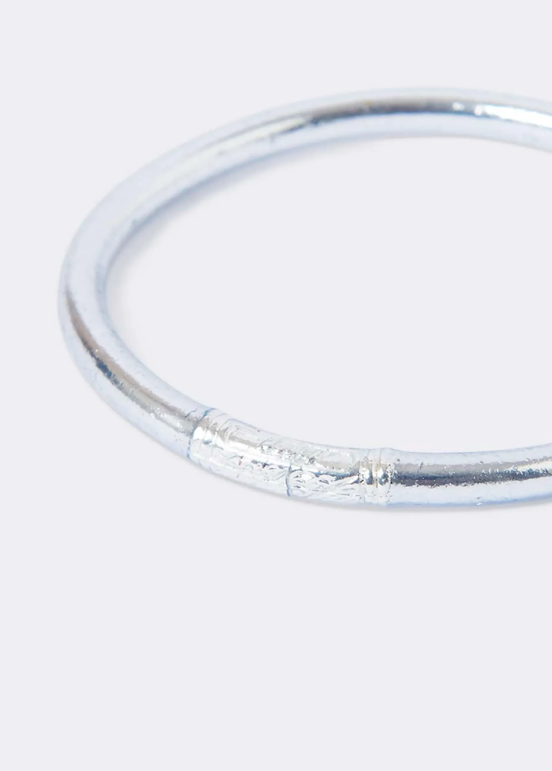 Pulsera plateada Pan de Oro con grabado LUCKY and RICH hechas a mano. Las pulseras Pan de Oro difunden amor, suerte, protección, unidad y buena fortuna para quien las lleva.