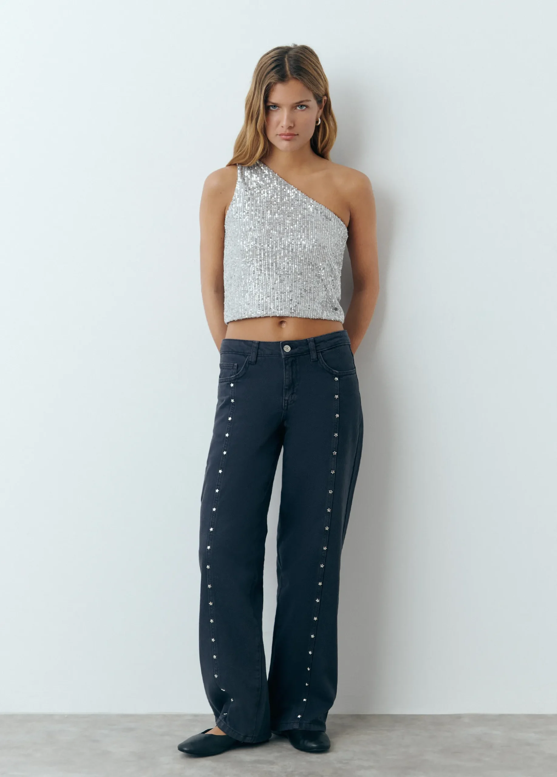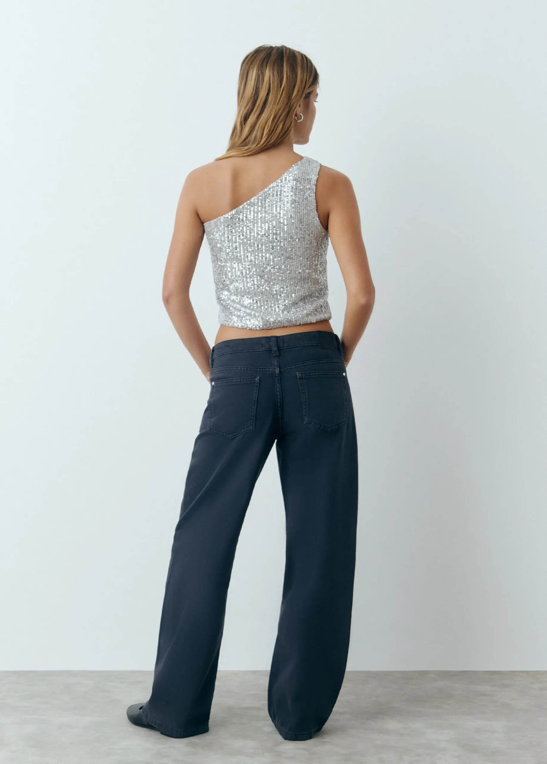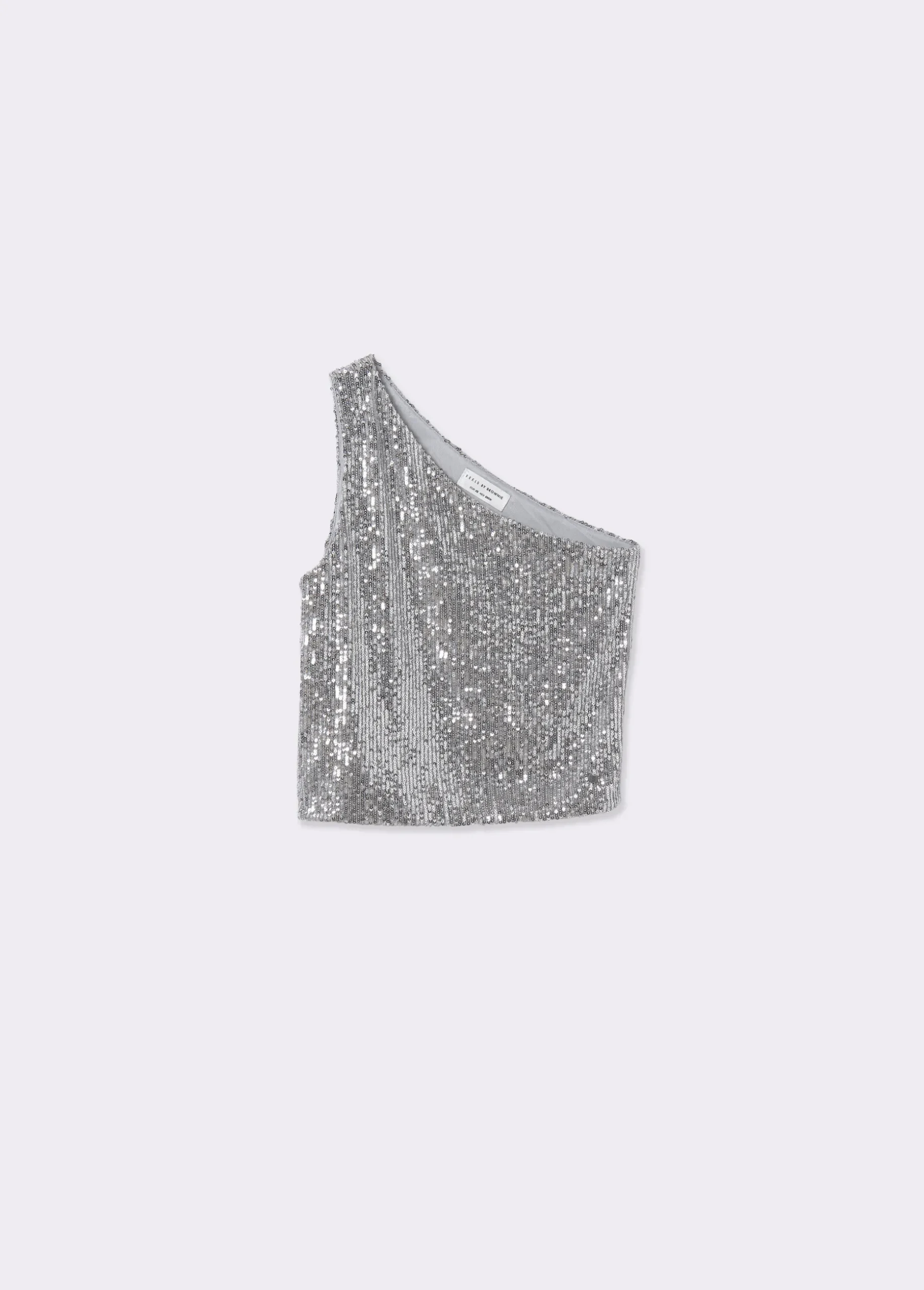 Top asimétrico con lentejuelas plateadas.