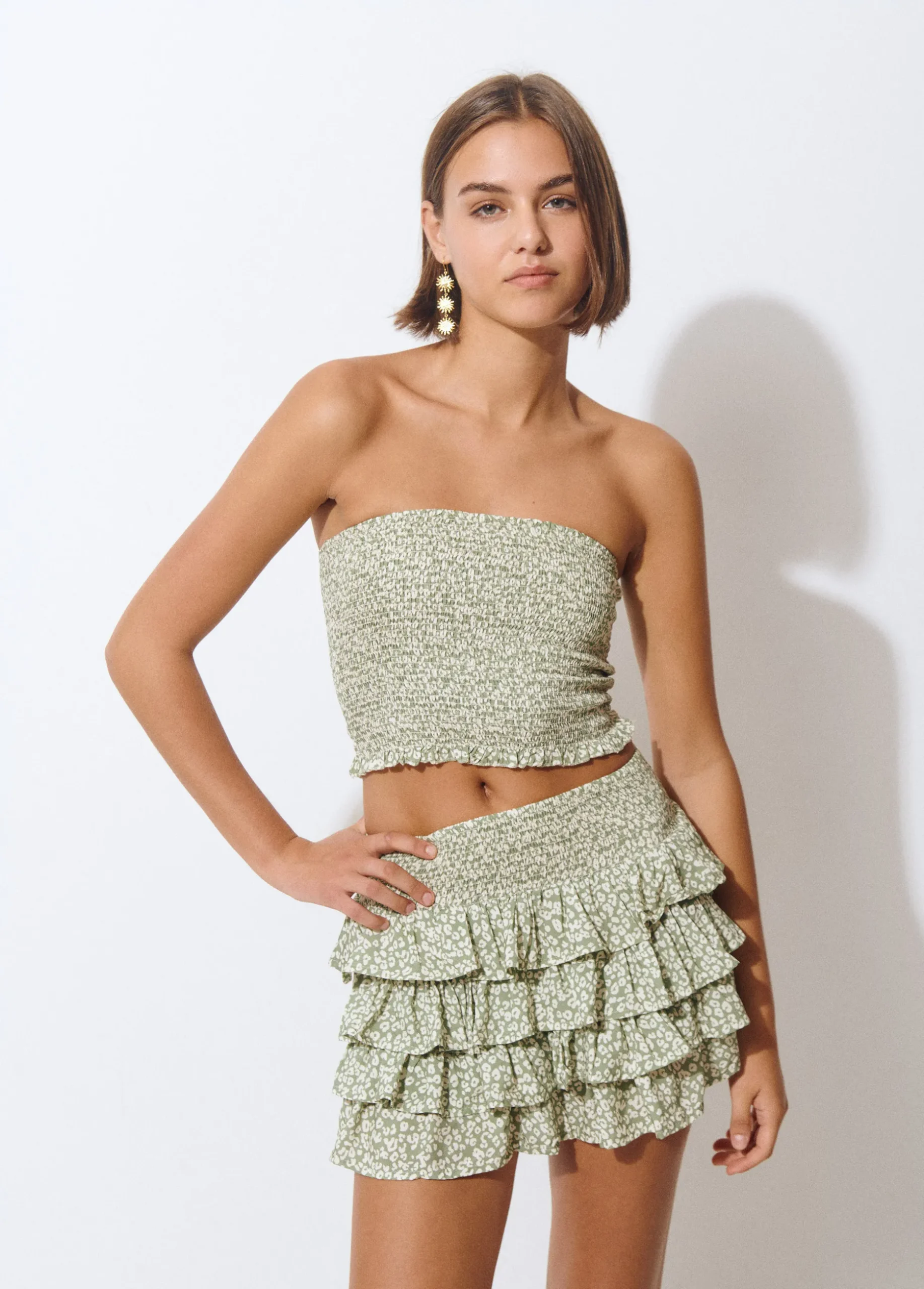 Top bandeau estampado de animal print con smock y cuello halter mediante lazada.