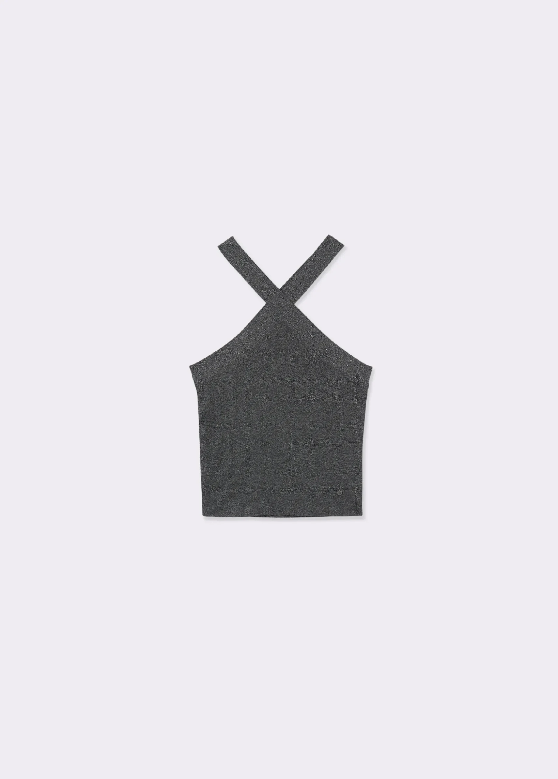 Top sin mangas, cuello cruzado con tachas y detalle de hilo metalizado.