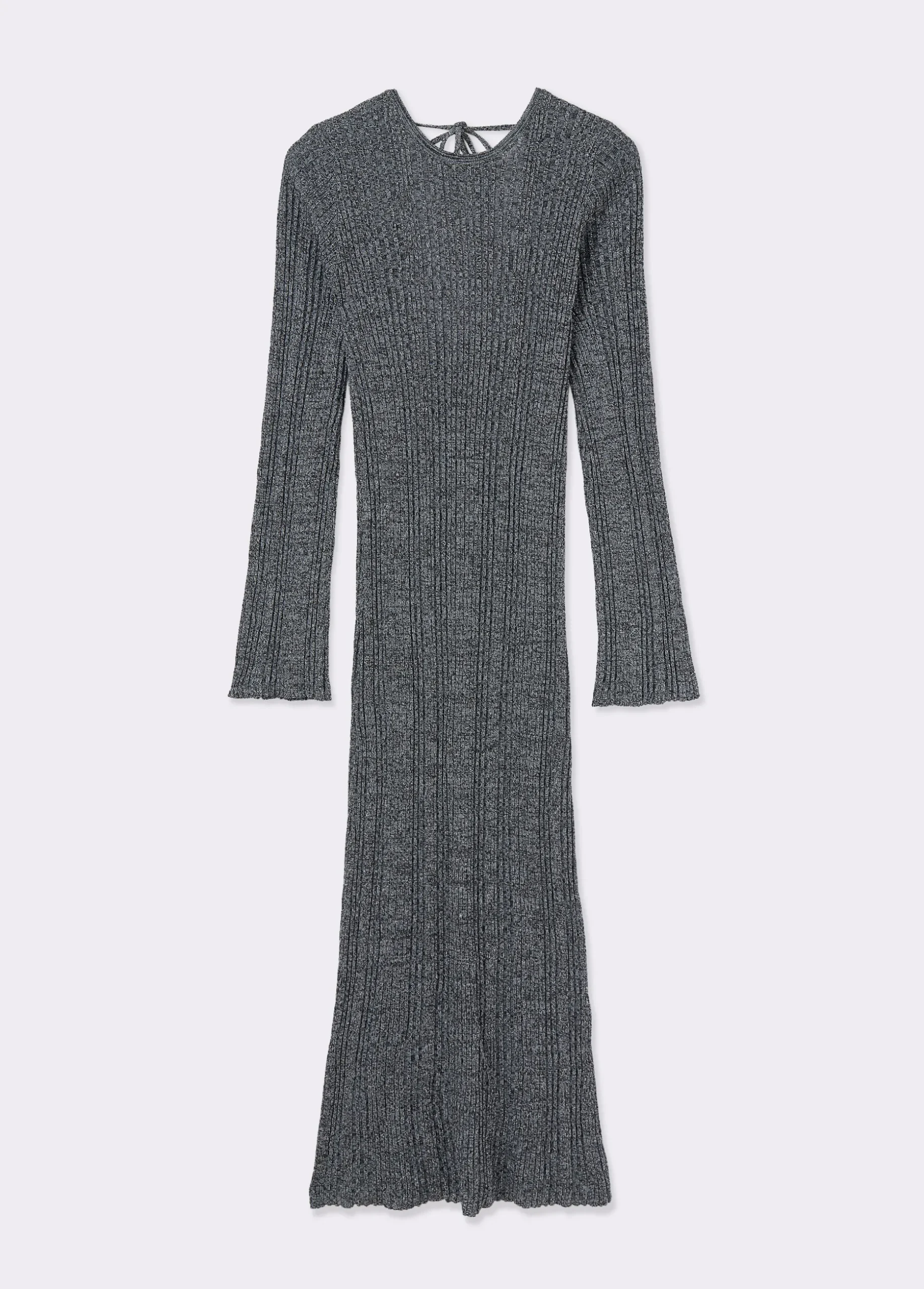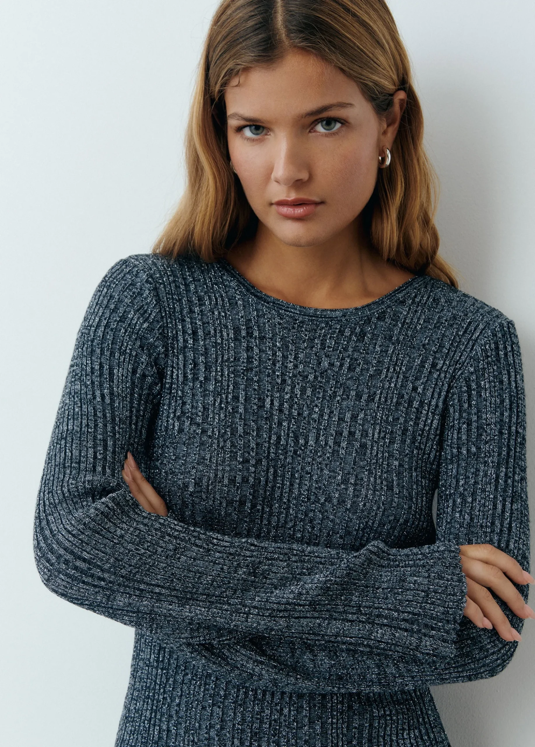 Vestido de manga larga, cuello redondo y detalles con hilo metalizado.