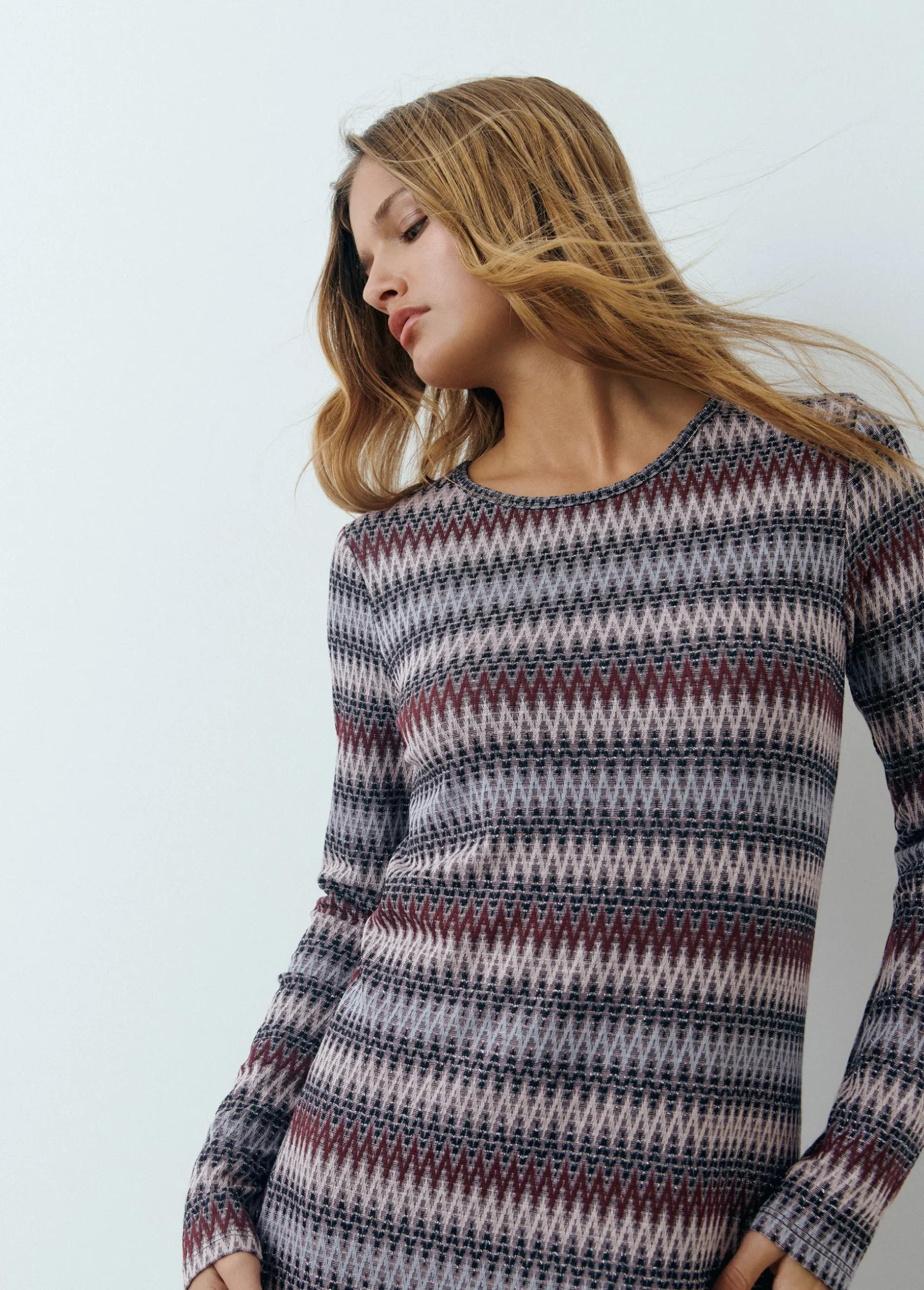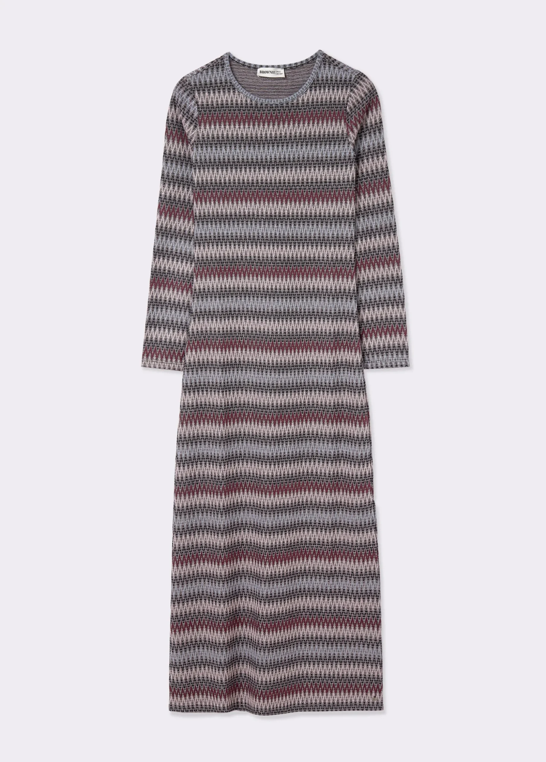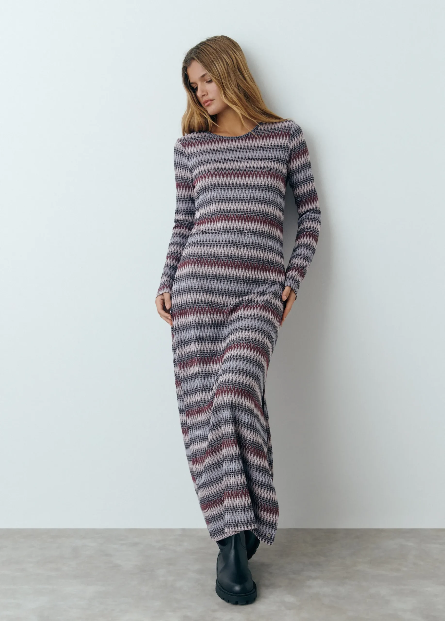 Vestido de rayas de manga larga, cuello redondo y detalles con hilo metalizado.