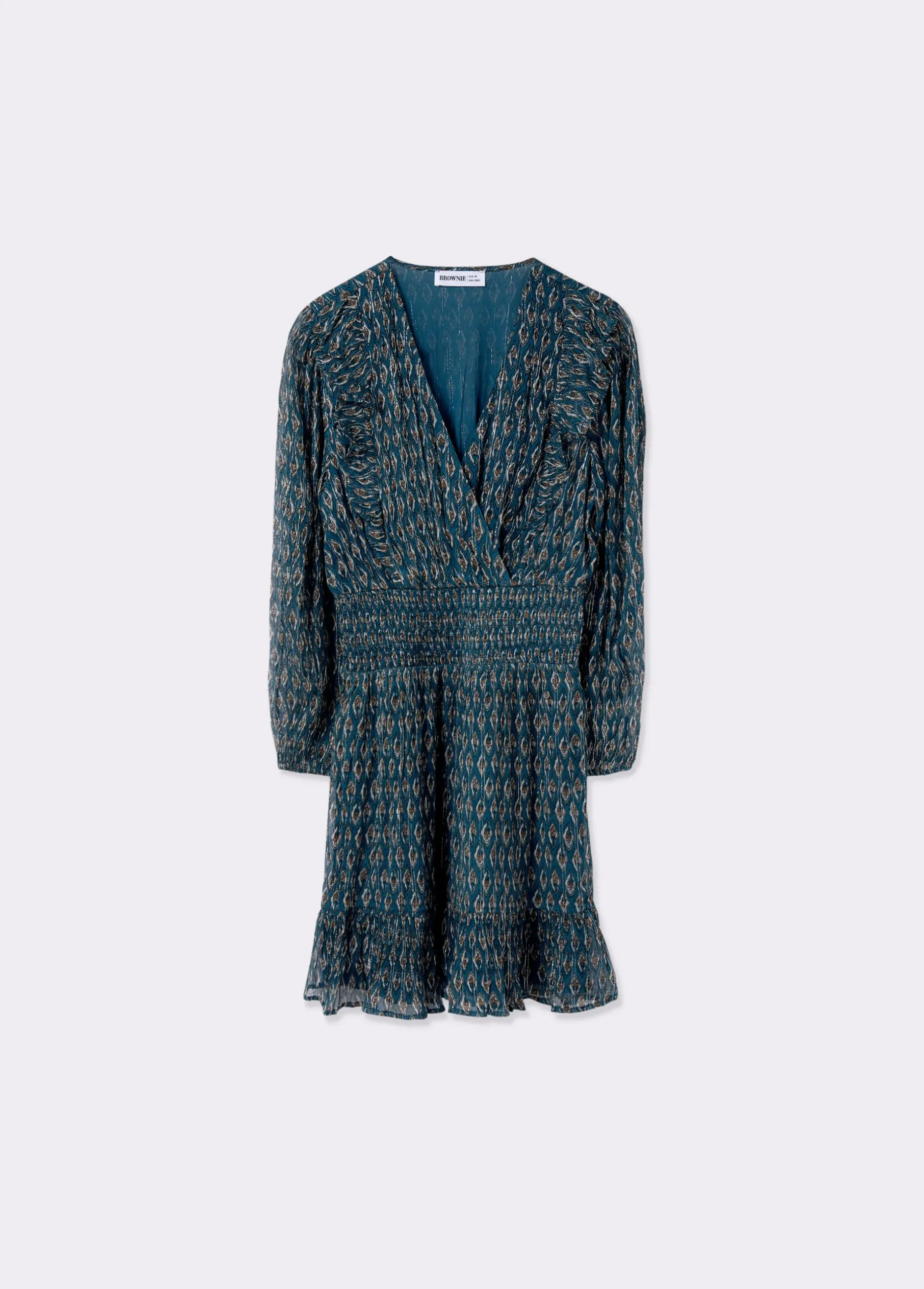 Vestido estampado fluido de manga larga abullonada, cuello de pico, smock en la cintura y volantes.