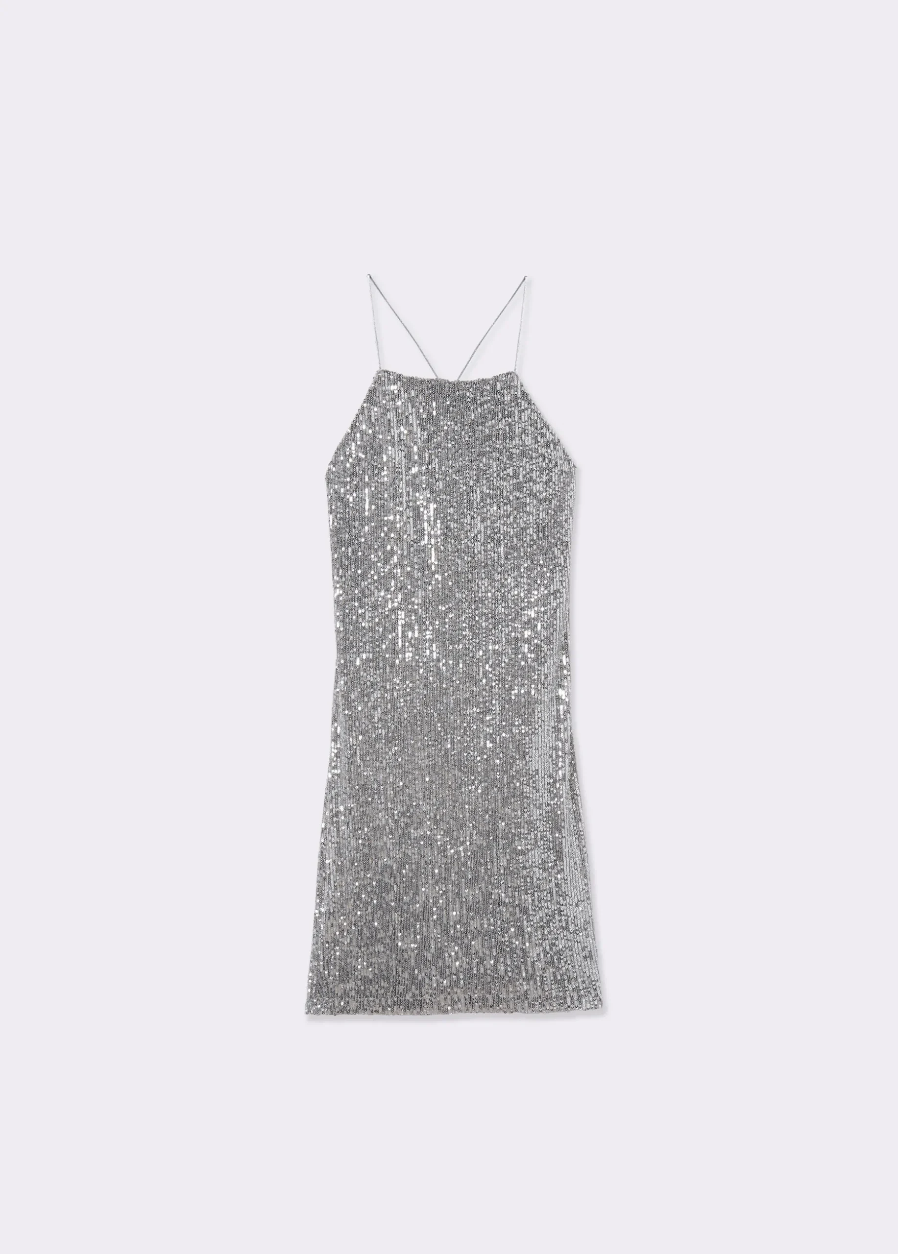 Vestido corto de tirantes con lentejuelas plateadas.
